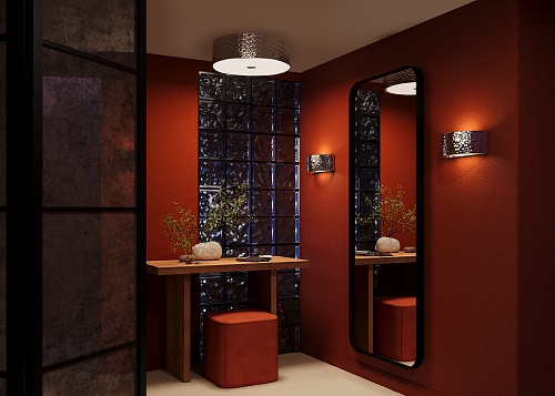 Арматура – металл в цветах хром и золото. Фактурный рисунок нанесен посредством чеканки. Стекло с рельефной поверхностью скрывает источники света. Декора тивный эффект «рябь на воде». Источник света - лампа с цоколем Е14.