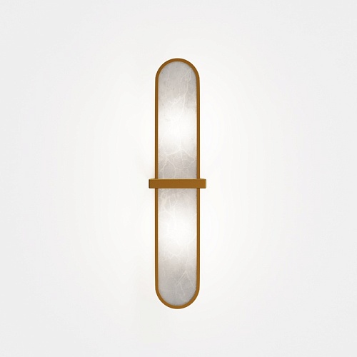 Арматура выполнена из металла, который гальванизирован в золотистый оттенок. Декор представлен небольшой пластиной из натурального камня с необычной текстурой. Дизайн сочетает округлые элементы и четкие прямоугольные линии. С помощью бра можно создавать уникальные настенные композиции. Источник света — цоколь E14. Переотраженный тип рассеивания.