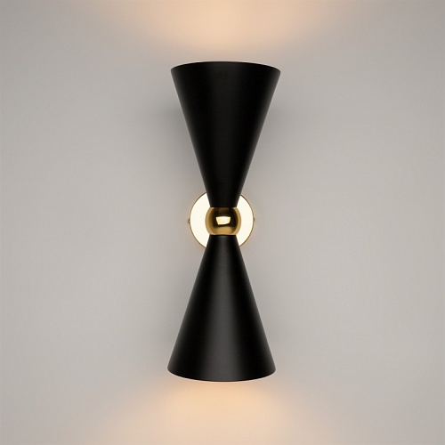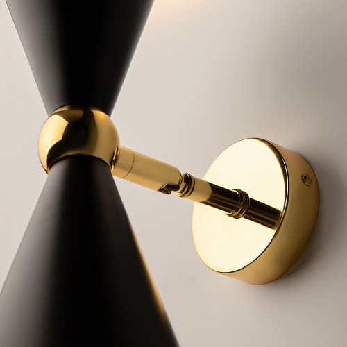 Материал арматуры - металл, оттенок – золото. Металлические плафоны изнутри окрашены в золотой цвет, снаружи в двух вариантах: черный и белый. Поворотный механизм, рожки вращаются. Источник света - лампа с цоколем Е14.