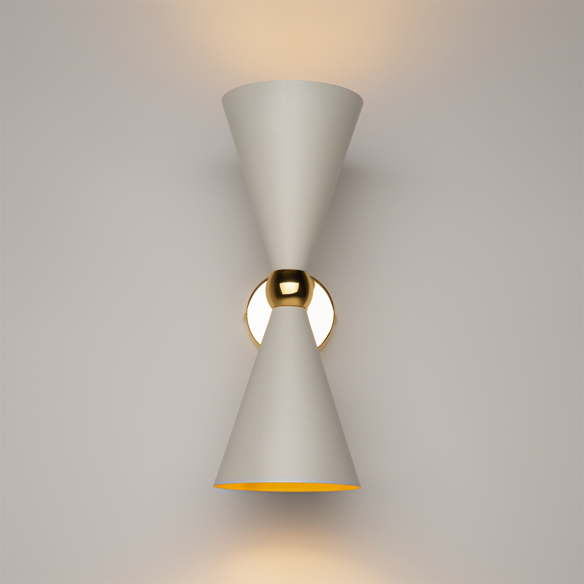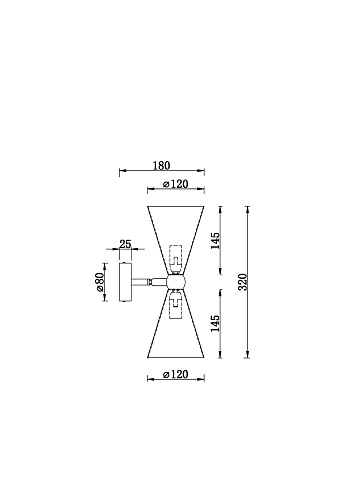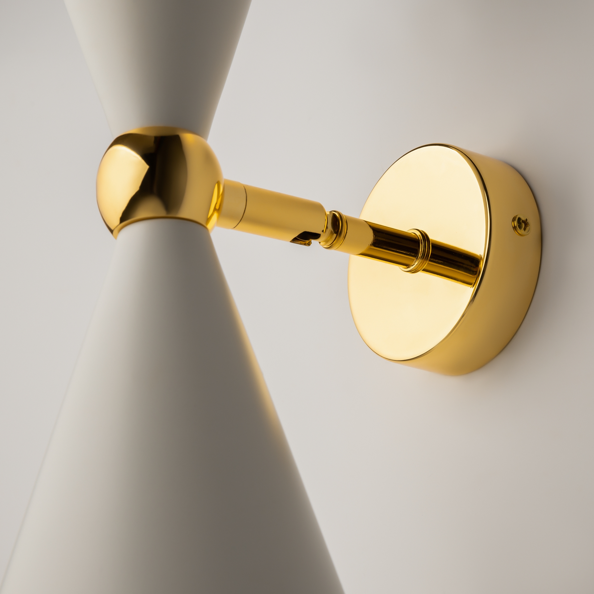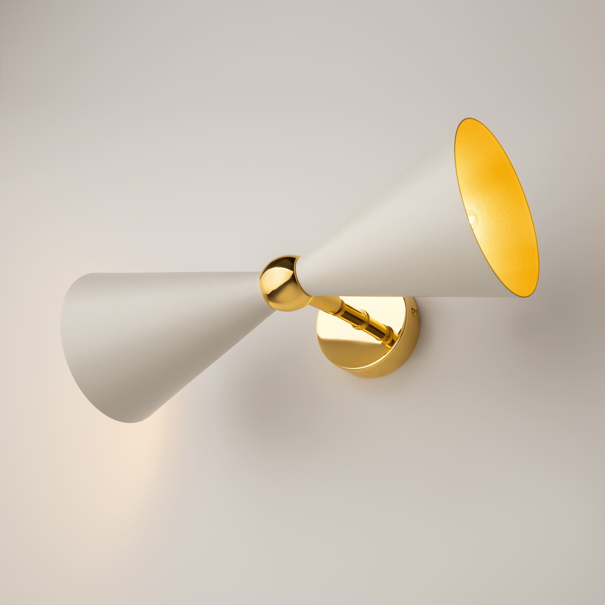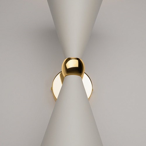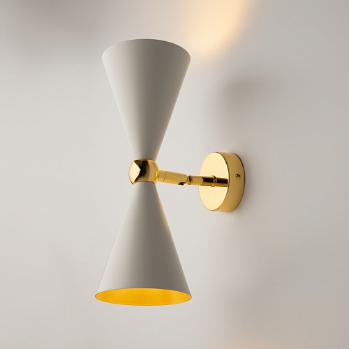Материал арматуры - металл, оттенок – золото. Металлические плафоны изнутри окрашены в золотой цвет, снаружи в двух вариантах: черный и белый. Поворотный механизм, рожки вращаются. Источник света - лампа с цоколем Е14.