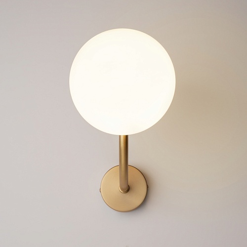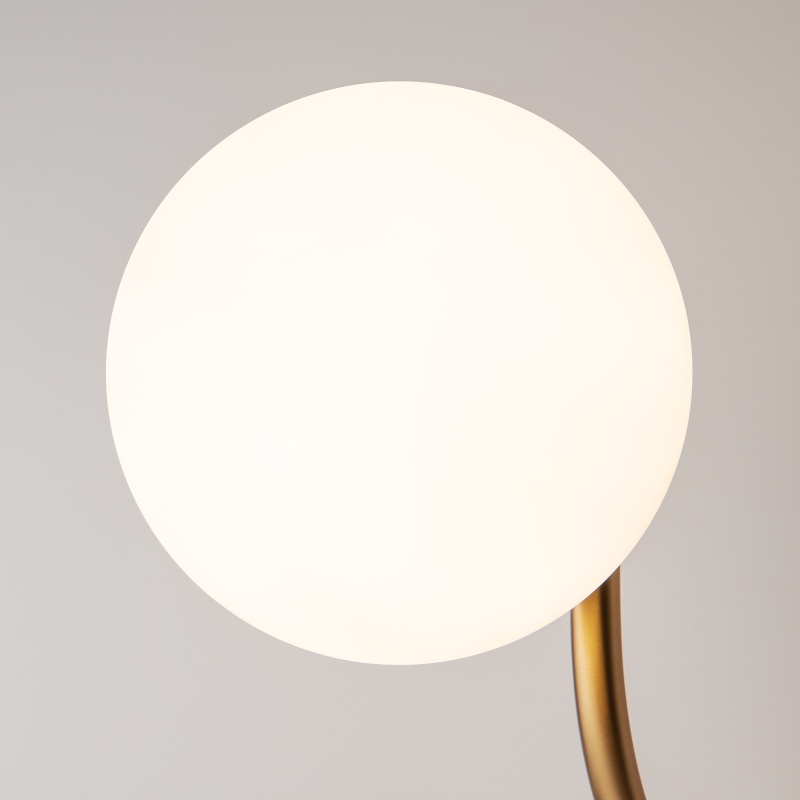 Арматура из металла окрашена в цвет латуни. Плафоны-сферы из матового белого стекла. Трендовые обтекаемые формы. Дизайн в стиле ретро. Источник света — лампы с цоколем Е14.