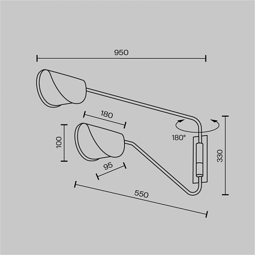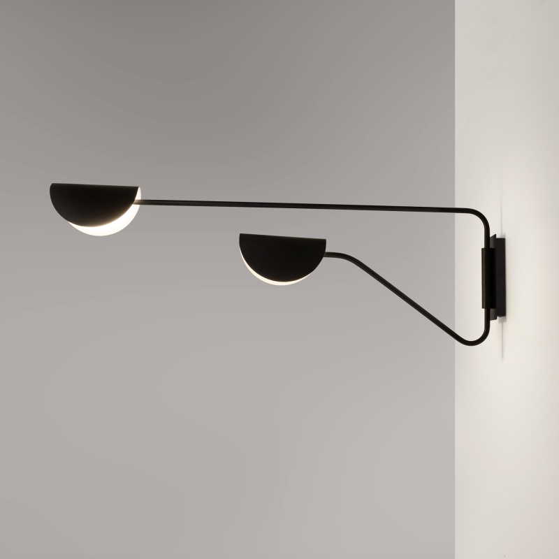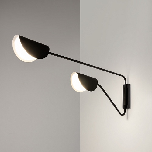 Арматура и плафоны из металла, цвет – черный. Оригинальная форма плафона с плавным контуром. Источники света скрыты под акриловым рассеивателем.