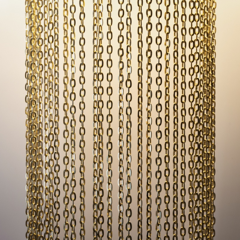 Арматура из нержавеющей стали. Цвет — золото. Абажур — белая ткань. Декоративные цепочки в тон арматуре. Съемный тканевый рассеиватель смягчает световой поток. Источники света — лампы с цоколем Е14.