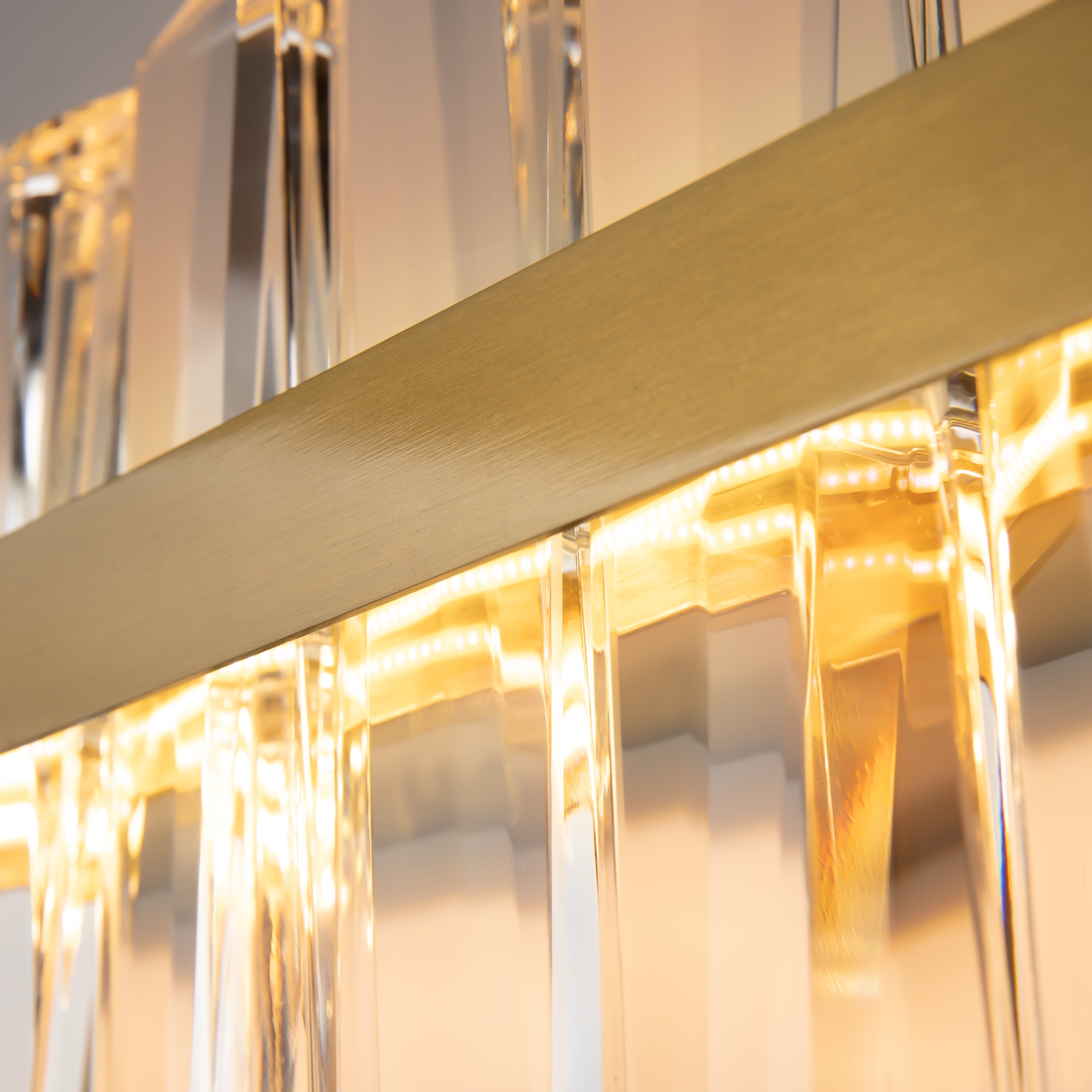 Материал арматуры - металл, цвет - латунь. Декор - объемные прозрачные хрустальные элементы с чередующимся рисунком. LED источник света, цветовая температура - 3000К. Регулируемая длина тросов.