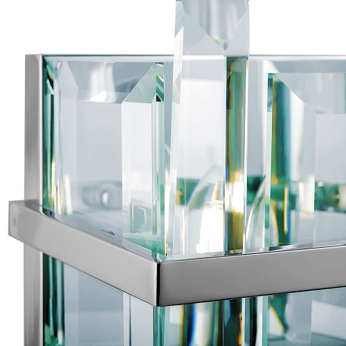 Арматура из металла, цвет – хром. Плафон составляют пластины из прозрачного оптического стекла. Металлический каркас плафона окрашен в тон арматуре. Высота подвесных моделелей регулируется.