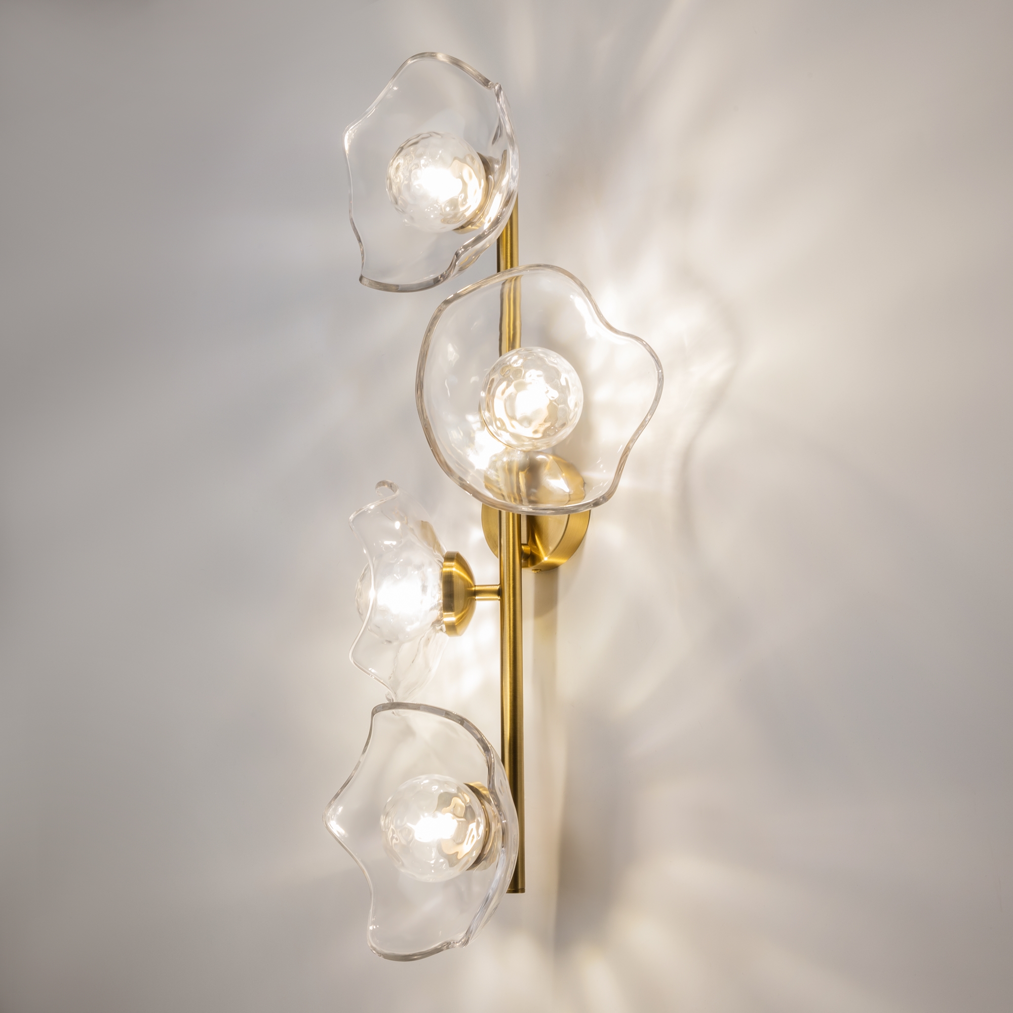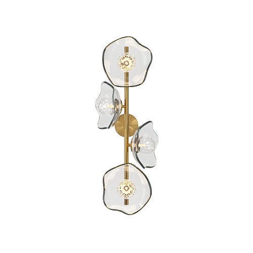 Арматура - металл, цвет - латунь. Плафоны-соцветия из литого стекла в плавных формах. Эффектные световые блики на плавных рельефах плафона. Источник света - лампа с цоколем G9.