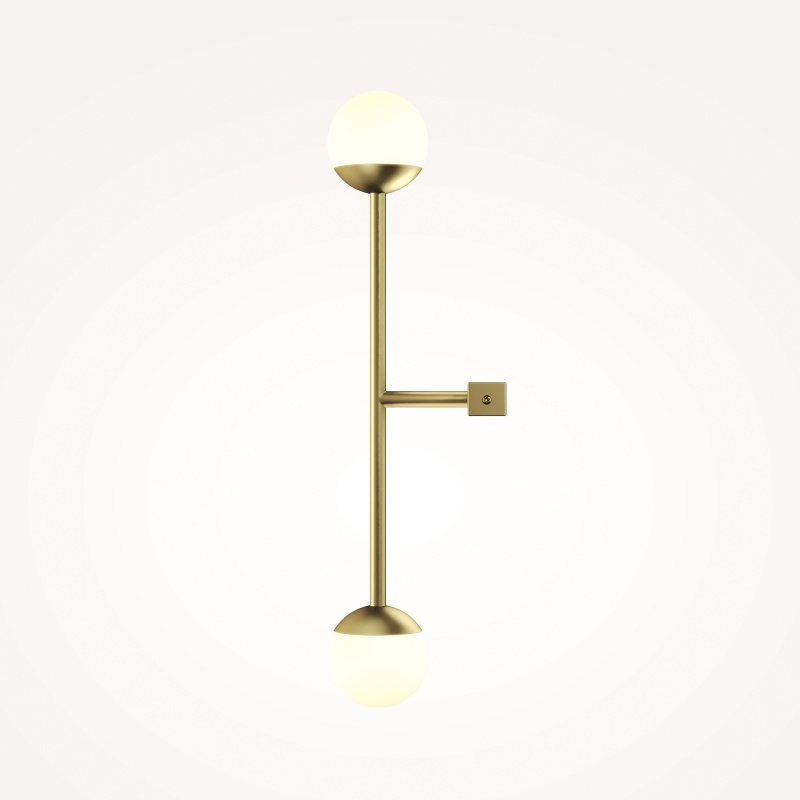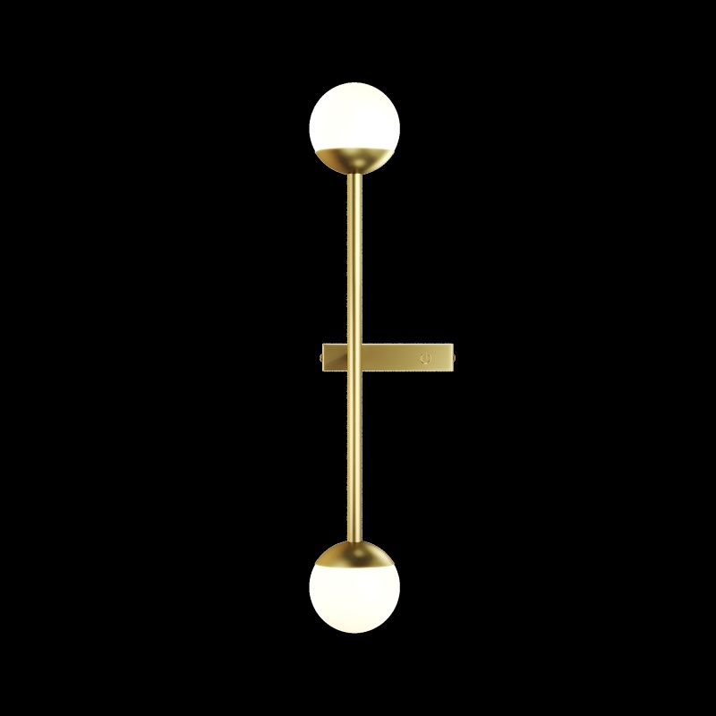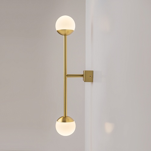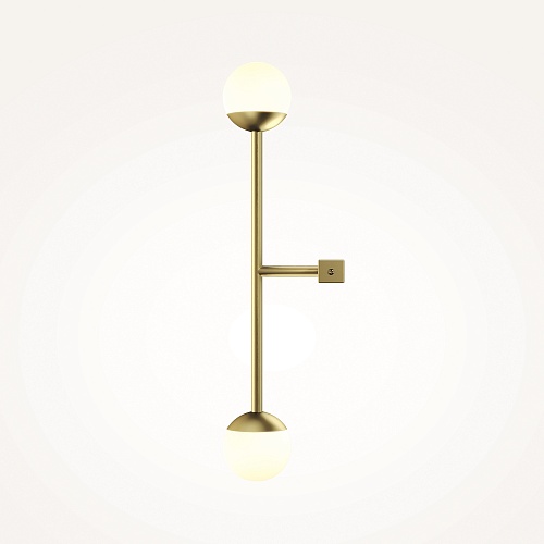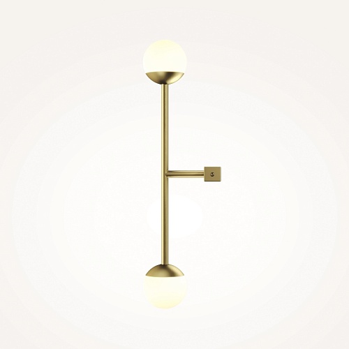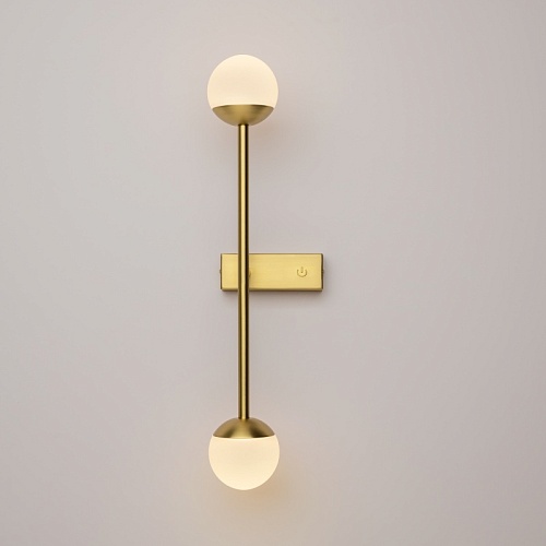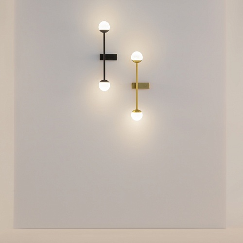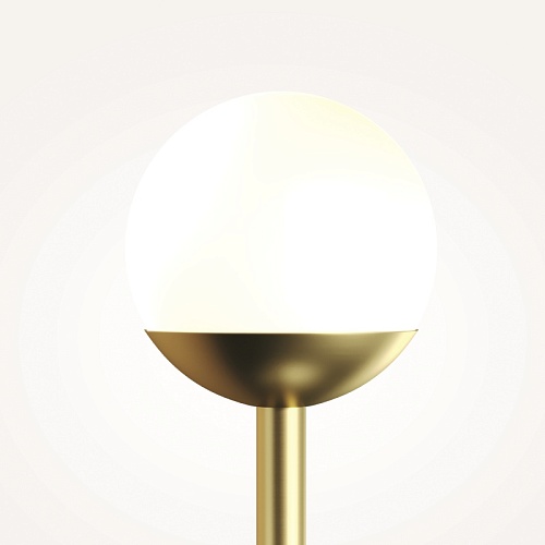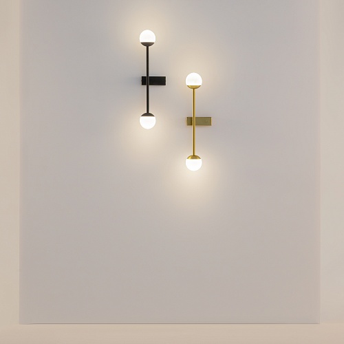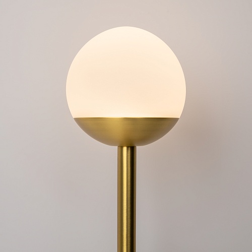 Материал арматуры — металл, цвета - латунь, черный. Плафоны-сферы из белого матового стекла. LED источник света, цветовая температура 3000К. Встроенный выключатель регулирует яркость света прикосновением с шагом 25%, 50%, 75% и 100%.