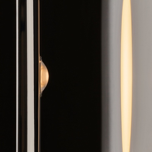 Металлическая арматура, цвета: черный, хром, золото. Источник света: LED-светодиод. Световая температура 3000К. Свет переотраженный, угол рассеивания 100 градусов. Дизайнерское решение с использованием линзы, создающей акцентный круг на стене и эффекта переотражения. Поверхность арматуры глянцевая, полузеркальная. Бра подойдет для зонирования помещений.