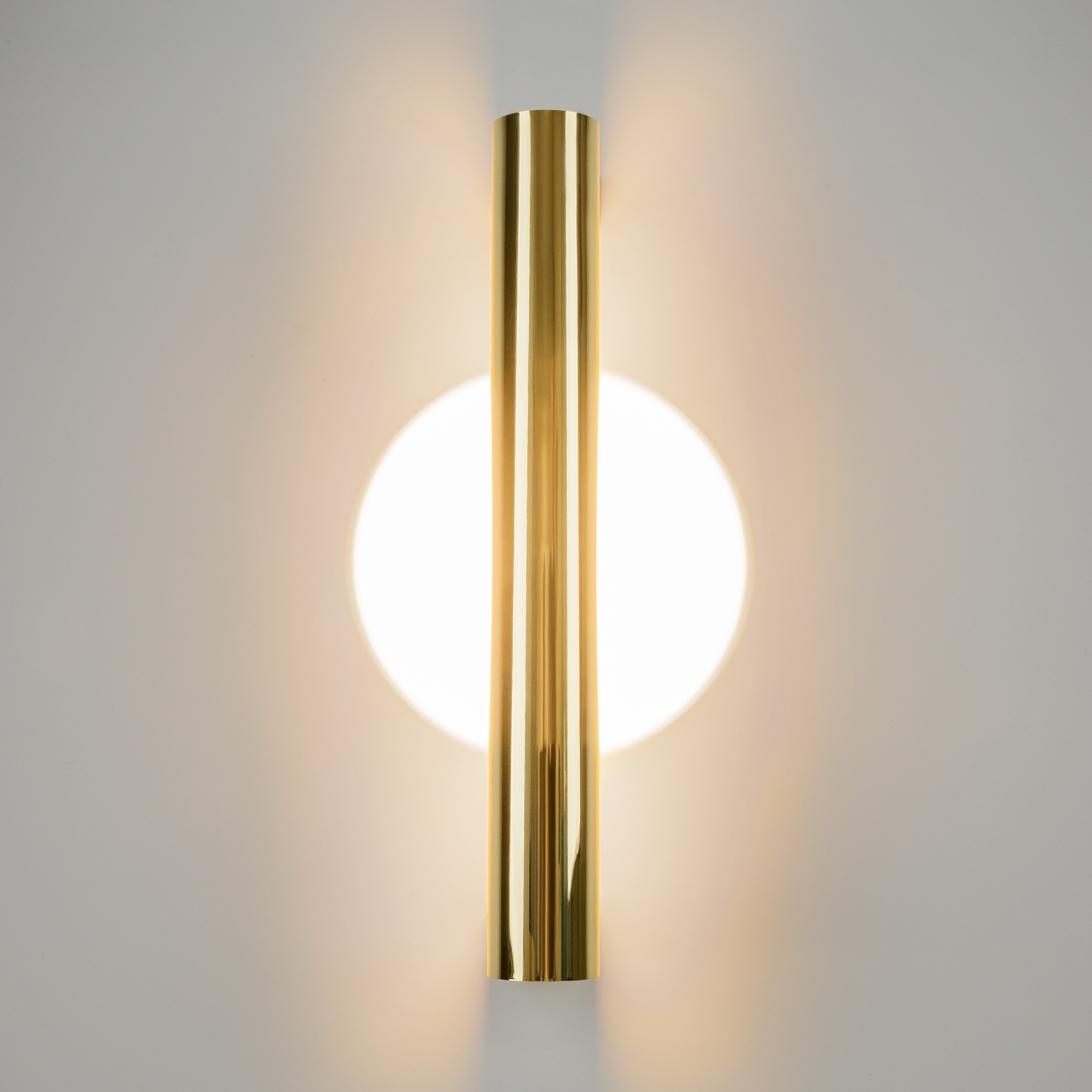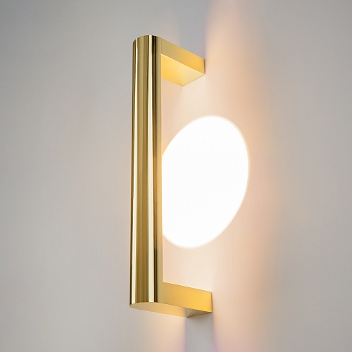 Металлическая арматура, цвета: черный, хром, золото. Источник света: LED-светодиод. Световая температура 3000К. Свет переотраженный, угол рассеивания 100 градусов. Дизайнерское решение с использованием линзы, создающей акцентный круг на стене и эффекта переотражения. Поверхность арматуры глянцевая, полузеркальная. Бра подойдет для зонирования помещений.