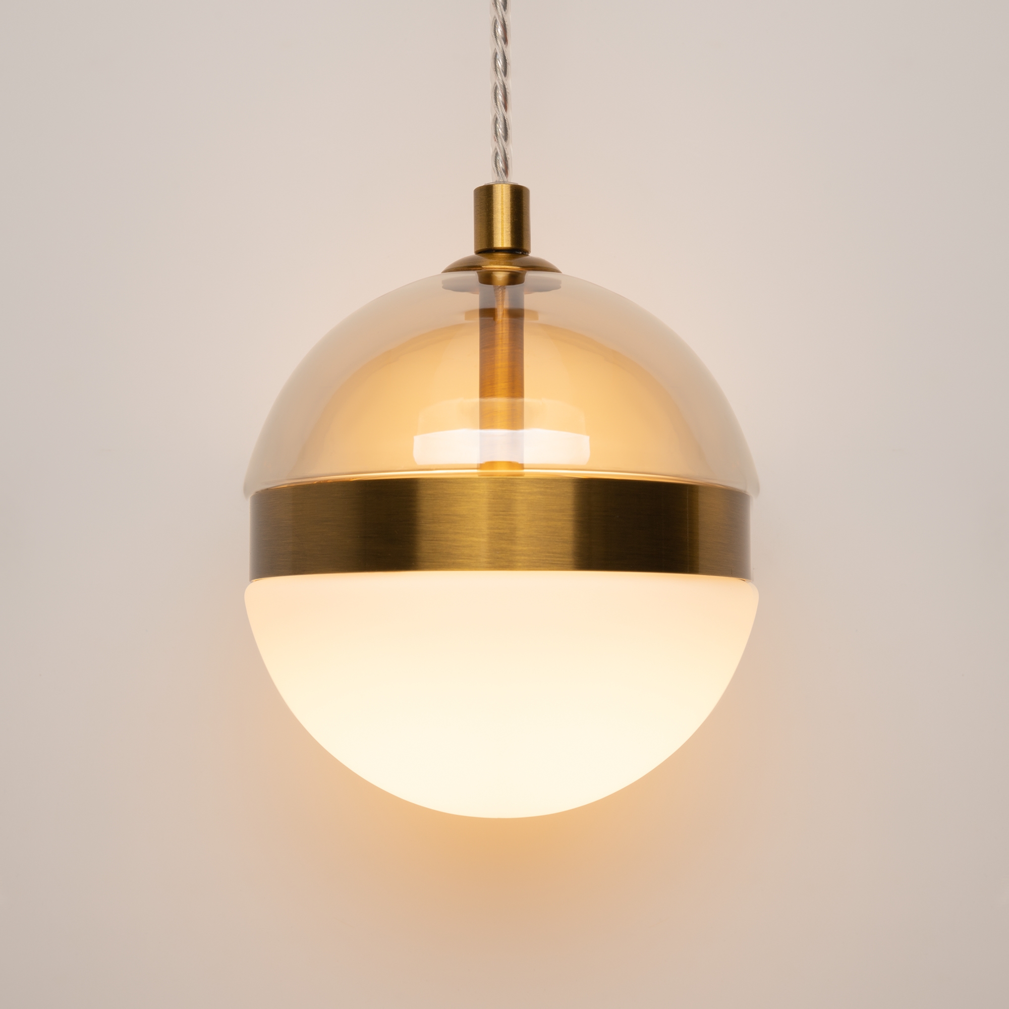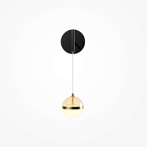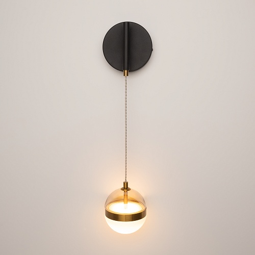 Черная потолочная чаша дополнена финишным антибликовым покрытием sandy, декоративный элемент плафона выполнен из металла цвета сатинированной латуни. Сочетание двух фактурных стекол в плафоне: нижняя полусфера из матового белого стекла для создания мягкого рассеянного света, верхняя часть плафона - из тонированного янтарного стекла. Внутри установлен LED-модуль, создающий равномерное освещение, направленное вверх и вниз. Цветовая температура – 3000К, угол рассеивания — 120°.