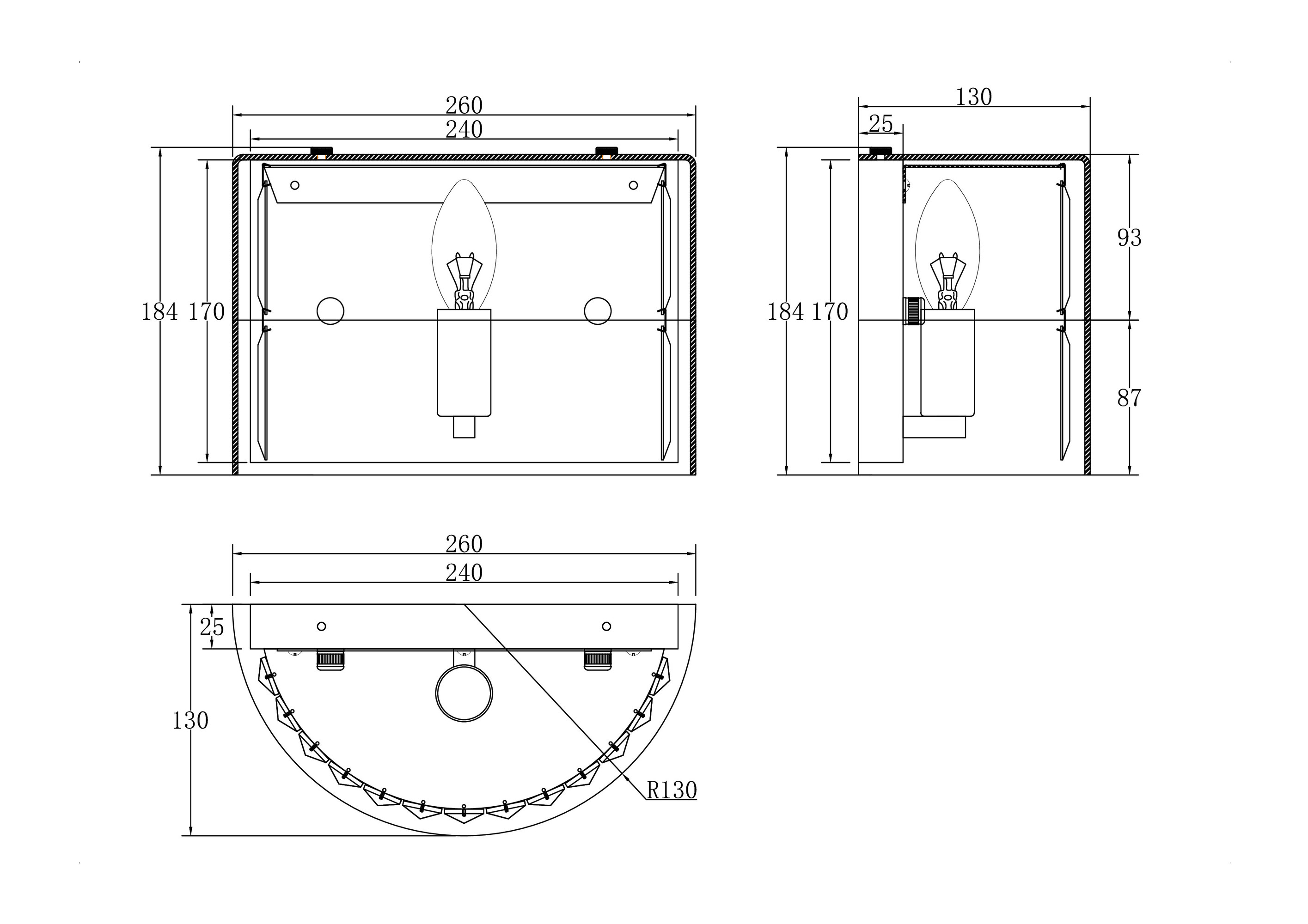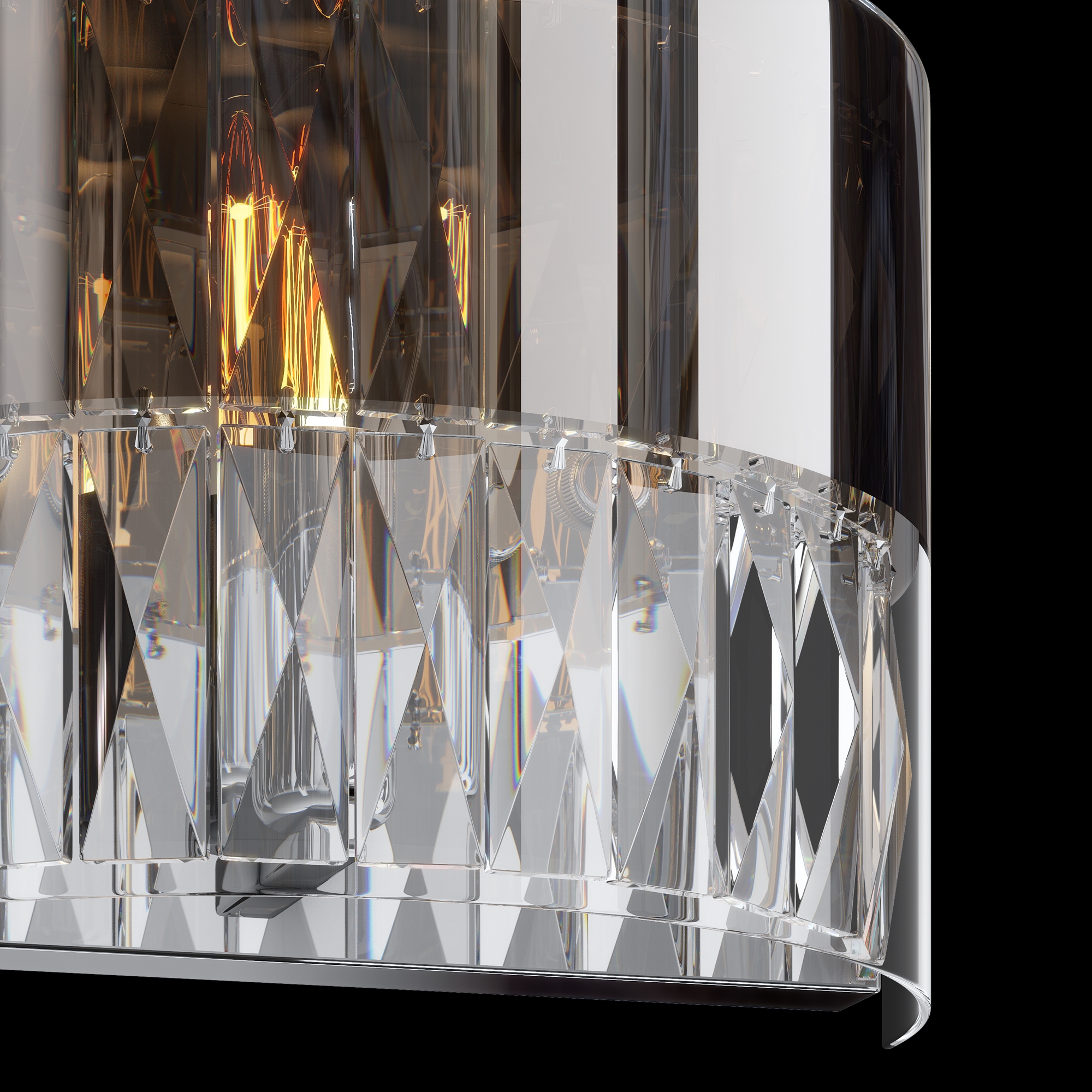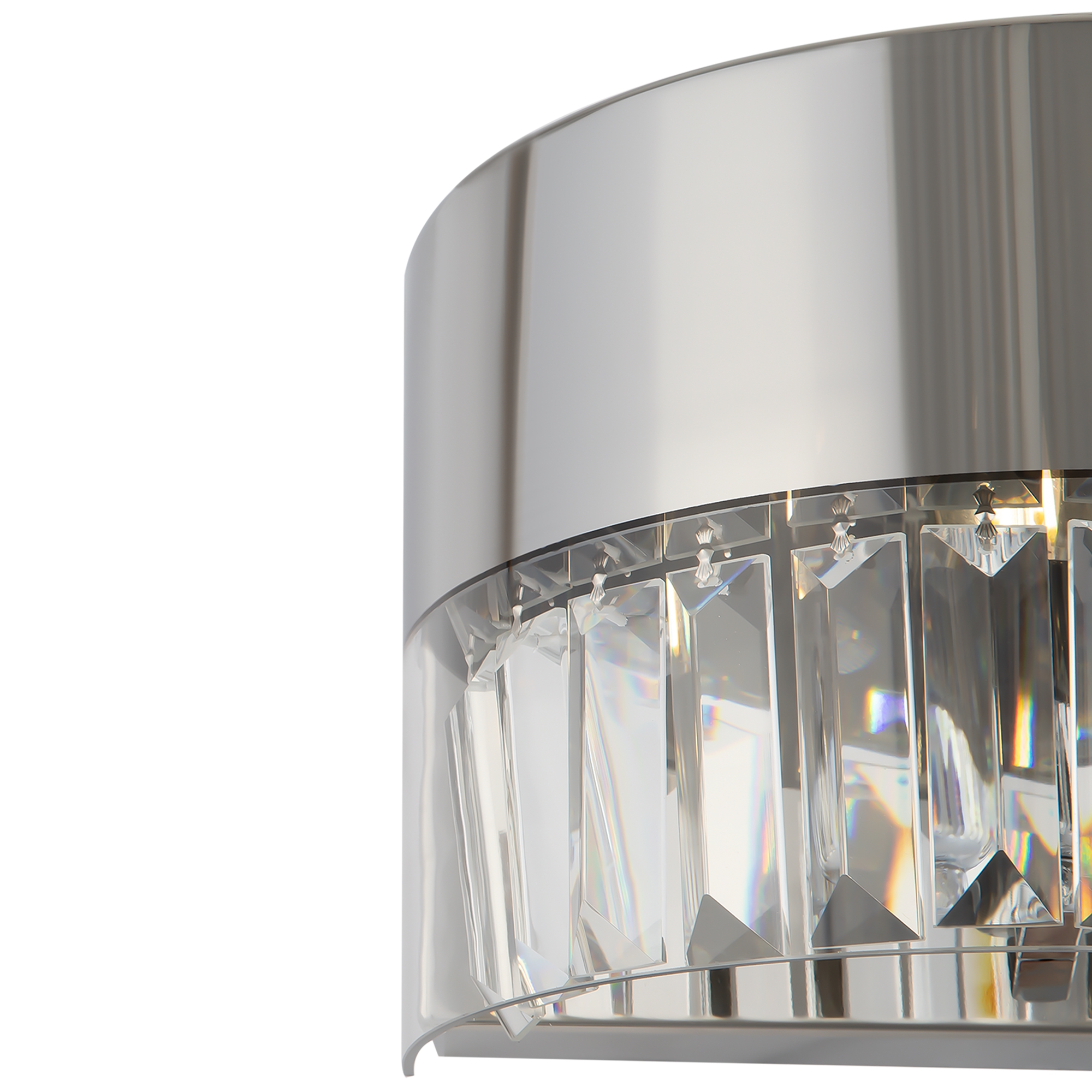 Арматура из нержавеющей стали в двух оттенках: хром, золото. Плафон из выду вного стекла, внутри – хрустальные подвесы. Часть плафона с зеркальным покры тием в тон арматуре. Цоколь Е14.
