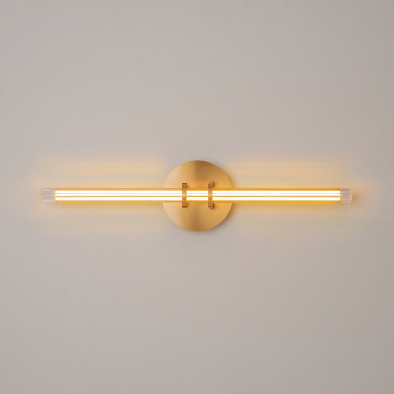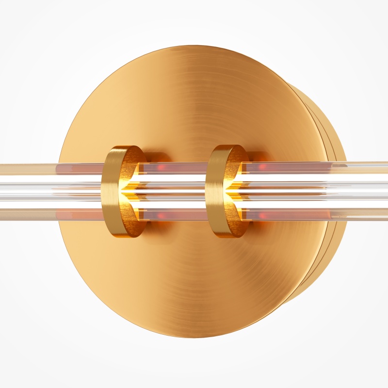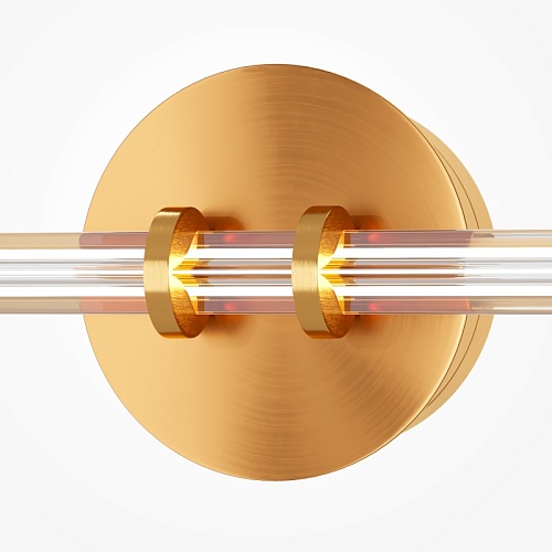 Металлическая арматура латунного цвета дополнена сатинированным финишным покрытием. Тонкие плафоны, изготовленные из рифленого стекла. Два варианта длины: 1200 и 1500 мм. Трехметровый провод можно регулировать для установки в помещениях с высокими потолками. Цветовая температура LED-источника света — 3000К, угол рассеивания — 120 градусов.