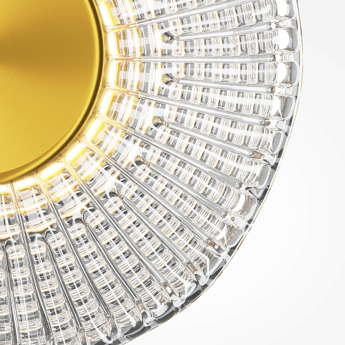 Металлическая арматура, цвет - латунь. Декоративные плафоны из литого стекла. Они рассеивают свет и дают легкие блики на стенах. Стекло плафонов может быть прозрачным или тонированным с паттерном молочного оттенка. Встроенный LED-источник света имеет цветовую температуру 3000 К, угол рассеивания — 120 градусов.