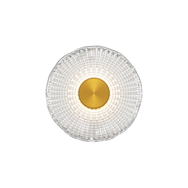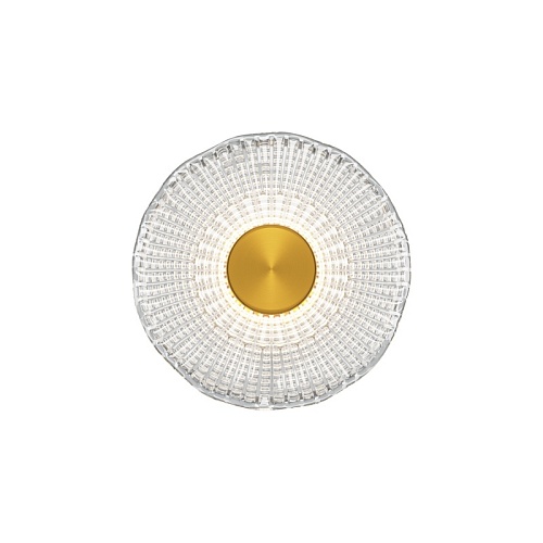 Металлическая арматура, цвет - латунь. Декоративные плафоны из литого стекла. Они рассеивают свет и дают легкие блики на стенах. Стекло плафонов может быть прозрачным или тонированным с паттерном молочного оттенка. Встроенный LED-источник света имеет цветовую температуру 3000 К, угол рассеивания — 120 градусов.