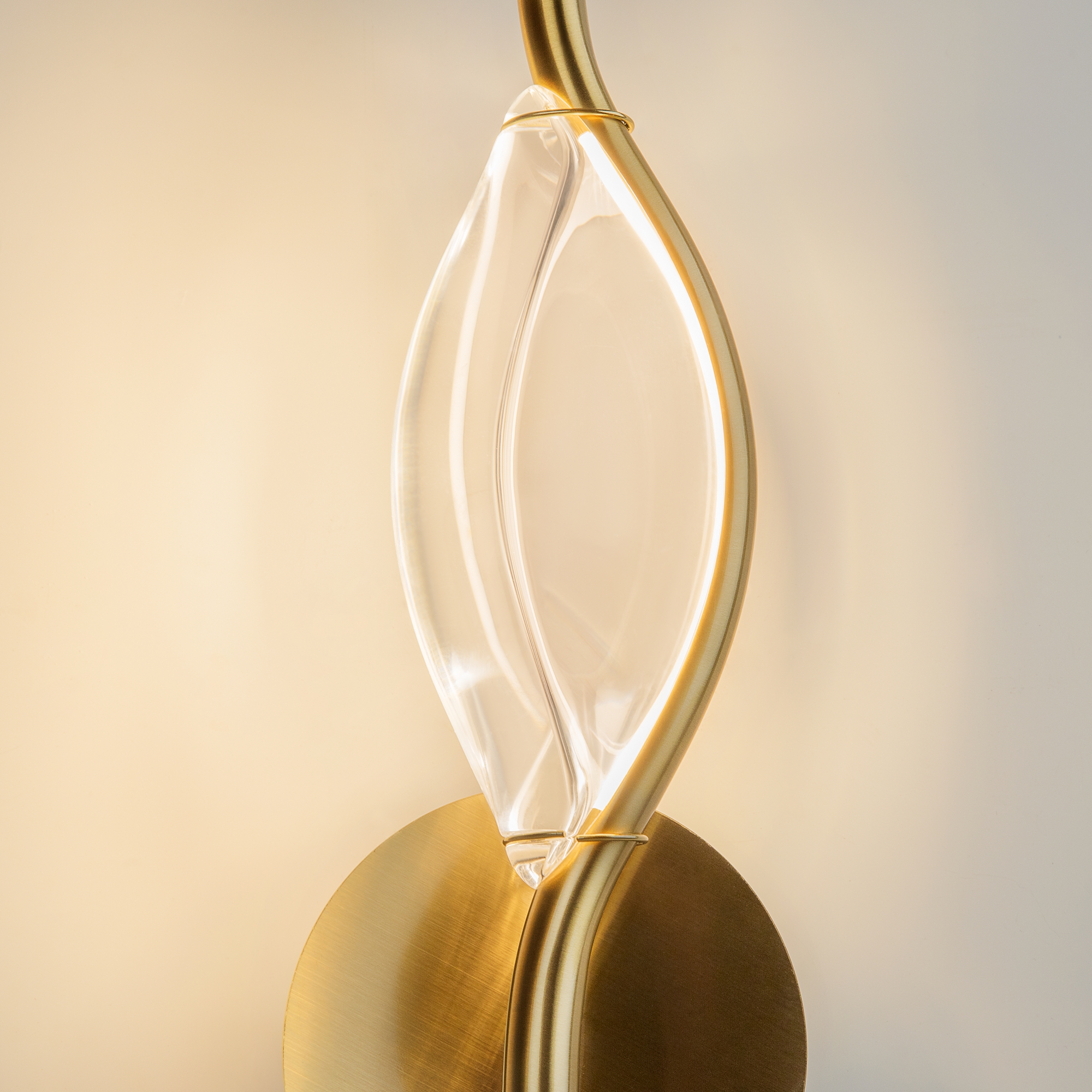 Алюминиевая арматура, цвет - латунь. Источник света: LED. Цветовая температура — 3000К, угол рассеивания — 120 градусов. Прозрачный рассеиватель из акрилового стекла. Светодиодный модуль установлен в обрамление из тонкой металлической арматуры.