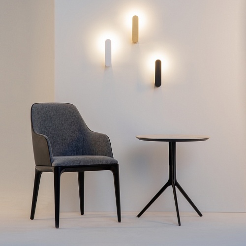 Металлический корпус в трех цветовых вариантах: черный, белый, латунь. Серия универсальна, светильники подойдут для большинства интерьеров. Источник света — LED. Цветовая температура – 3000 K. Тип рассеивания — переотраженный, угол рассеивания — 125°.