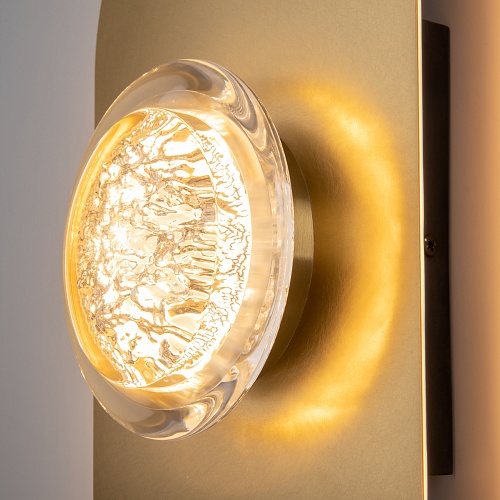 Арматура из металла цвета латунь с сатинированным финишным покрытием сочетается с прозрачными плафонами. Подвесные одинарные, горизонтальный и каскадные светильники оснащаются LED-модулем с двумя плоскими плафонами из акрила со сложным, актуальным паттерном на поверхности. Цветовая температура — 3000К, угол рассеивания — 125 градусов.
