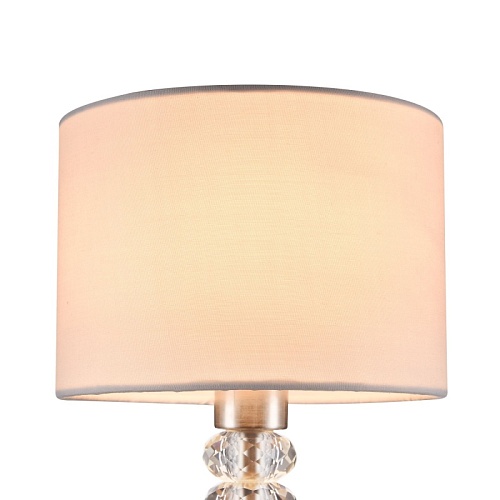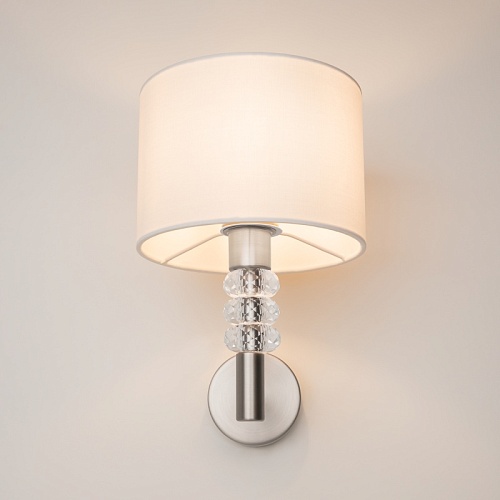 Металлическая арматура с гальваническим покрытием, цвет – никель. Абажуры из белого текстиля, нанесенного на ПВХ. Декор рожков – граненые кристаллы.