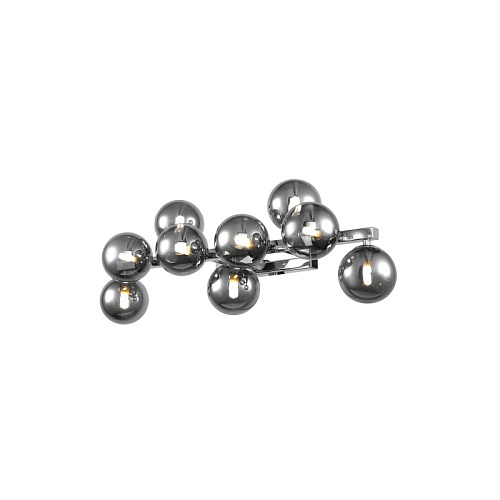 Металлическая арматура в четырех цветах: матовый черный, хром, золото, латунь. Плафоны — выдувное стекло. Цвета — дымчатый, янтарный, коньячный. Дизайн с имитацией молекулярной структуры. Высота подвесных светильников регулируется тросом. Лампа с цоколем G9.