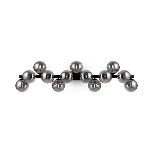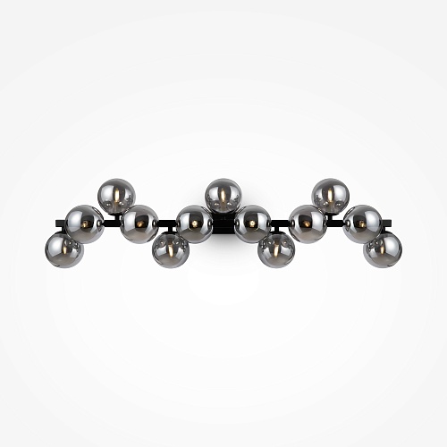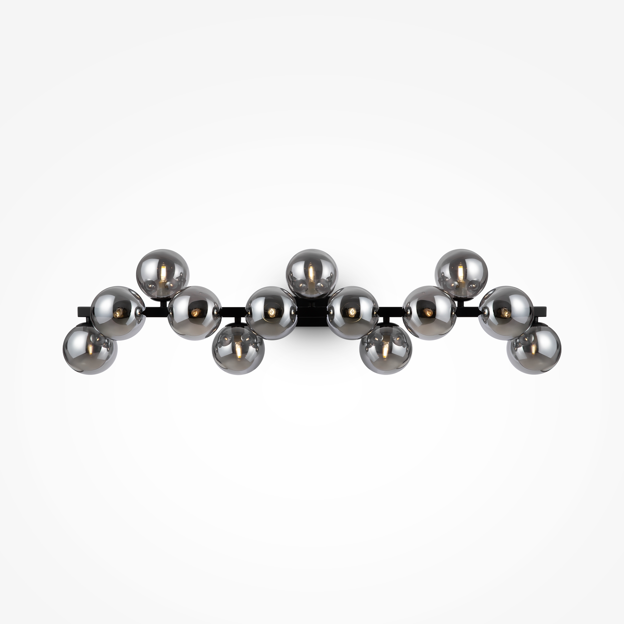 Металлическая арматура в четырех цветах: матовый черный, хром, золото, латунь. Плафоны — выдувное стекло. Цвета — дымчатый, янтарный, коньячный. Дизайн с имитацией молекулярной структуры. Высота подвесных светильников регулируется тросом. Лампа с цоколем G9.