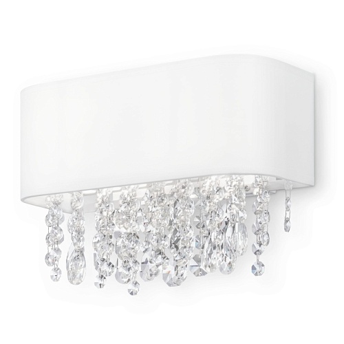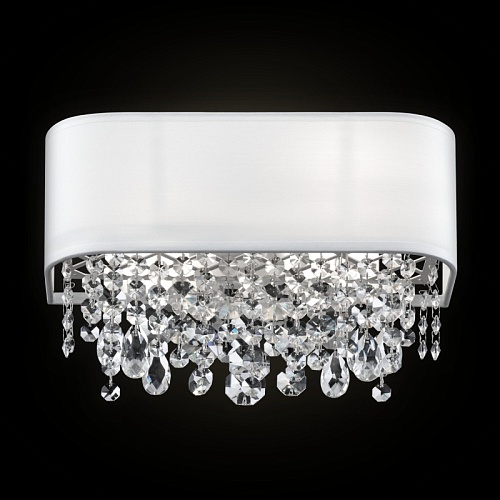 Металлическая арматура в белом цвете. Абажур – ткань, нанесенная на ПВХ, цвет – белый. Декор – подвески в виде граненых кристаллов. Высота подвесных светильников регулируется тросом.