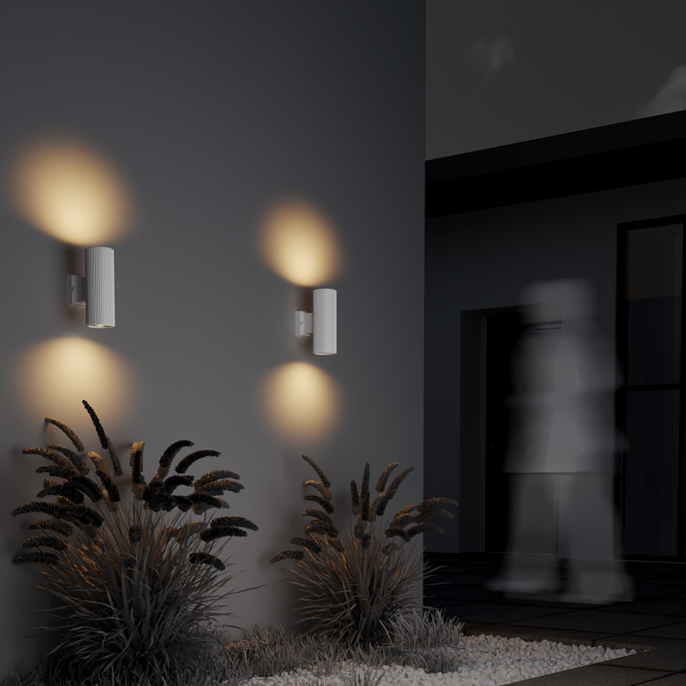 Фактурные настенные светильники для архитектурной подсветки. Металлический корпус устойчив к коррозии. IP 54 обеспечивает высокий уровень защиты от пыли и влаги. Комплектация светильников позволяет настраивать двухсторонний и однонаправленный световой поток. В серии представлены модели, рассчитанные на 1 и 2 лампы (Е27). Три оттенка на выбор: черный, серый, белый.
