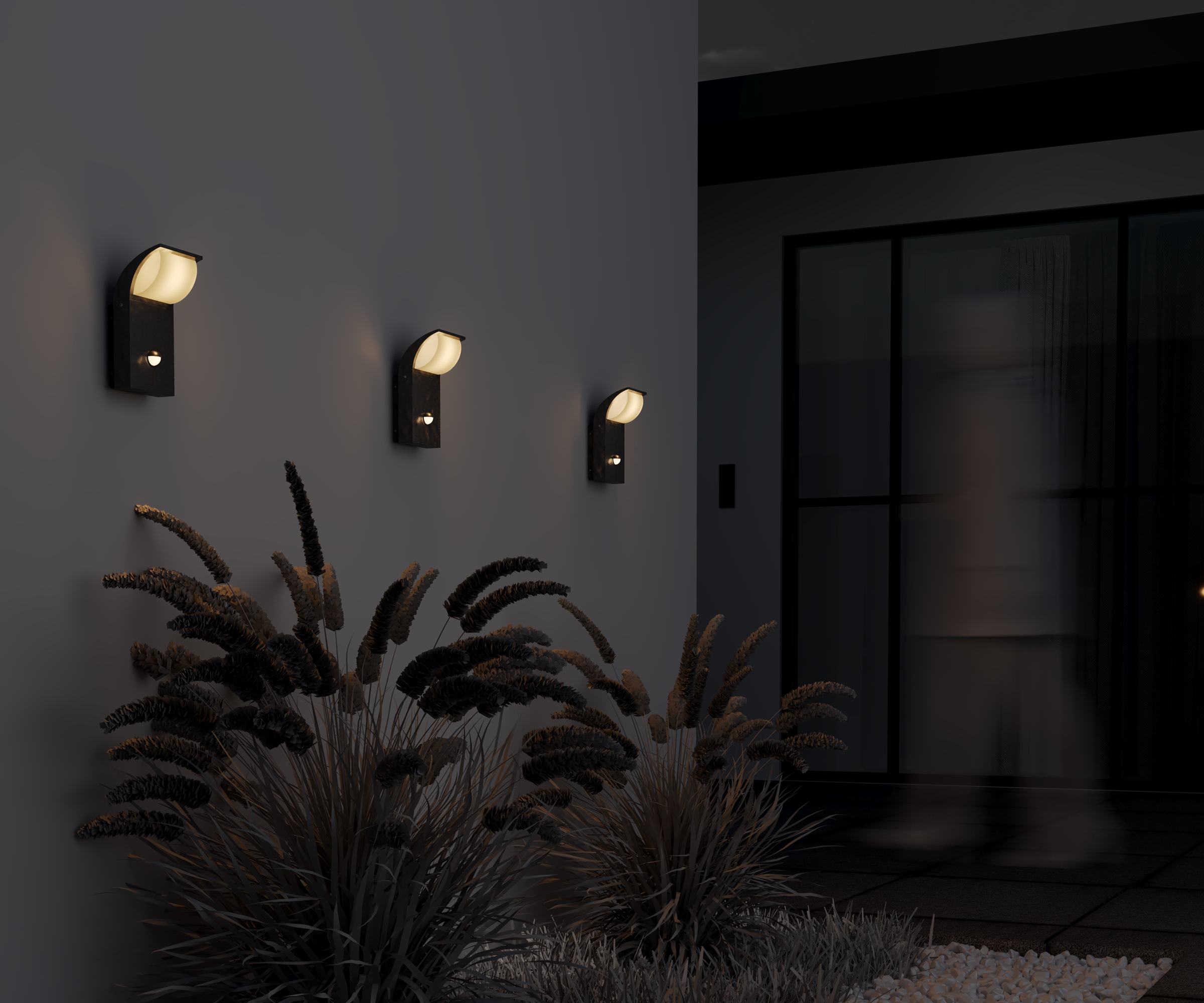 Материал корпуса - алюминий, цвет - графит. Белый матовый рассеиватель. LED-источник света. Цветовая температура 3000К. Наличие встроенного датчика движения у настенной модели. Степень защииты IP65 и IP44 настенной модели с датчиком движения.