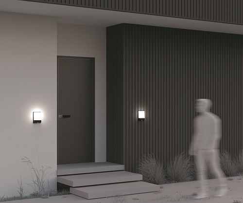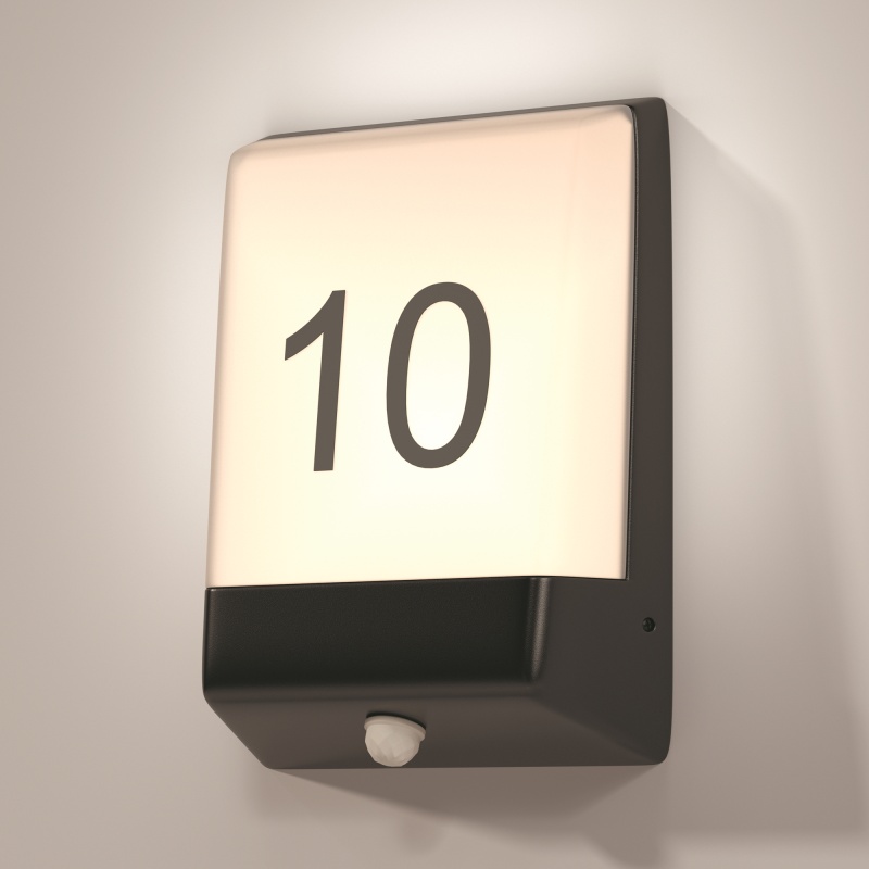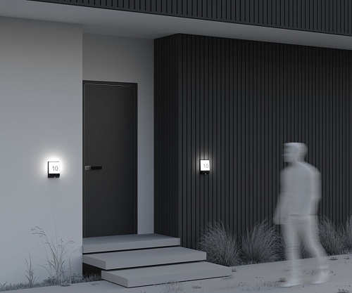 Материал корпуса - алюминий, цвет - графит. Оригинальный рассеиватель из белого матового стекла с возможностью наносить цифровые обозначения (номер дома и др.). Набор цифр в комплекте. LED-источник света, цветовая температура 3000К. Степень защиты - IP44.