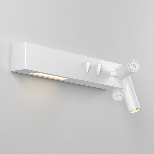 Настенные прикроватные светильники с двумя встроенными источниками света. Локальная подсветка позволит осветить книгу или журнал, а рассеянная создаст атмосферу непринужденности. Светильник управляется выключателями, расположенными на корпусе. В качестве обоих источников света использованы встроенные светодиоды теплого спектра.