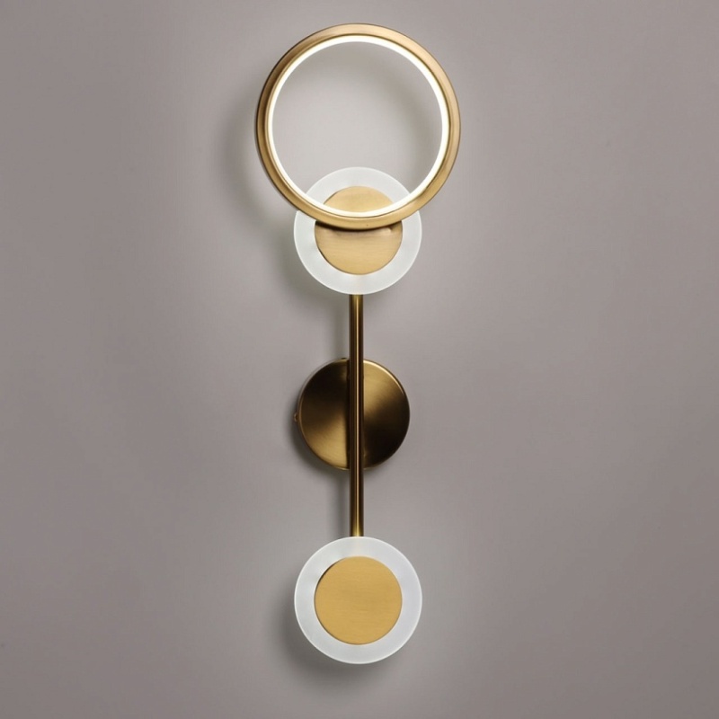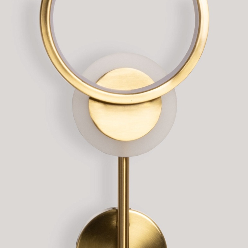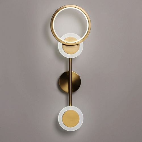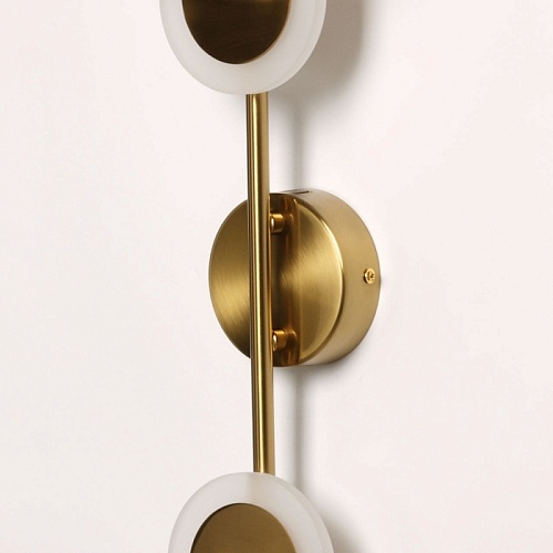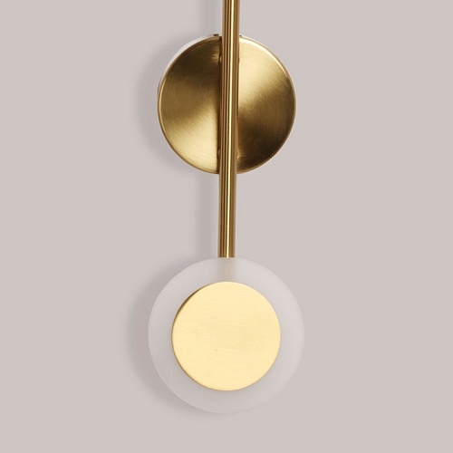 Металлическое основание настенного бра окрашено в цвет латуни. Корпус плафона выполнен из сплава алюминия с цинком и окрашен в цвет основания. Светодиодные источники света закрыты матовым акрилом.