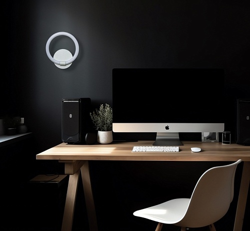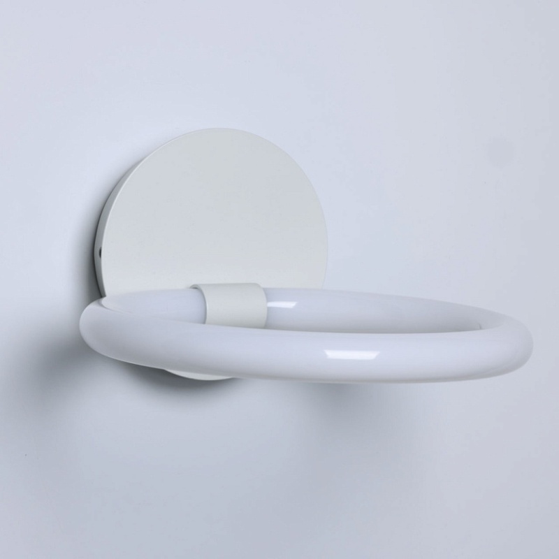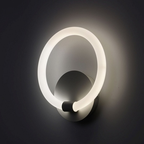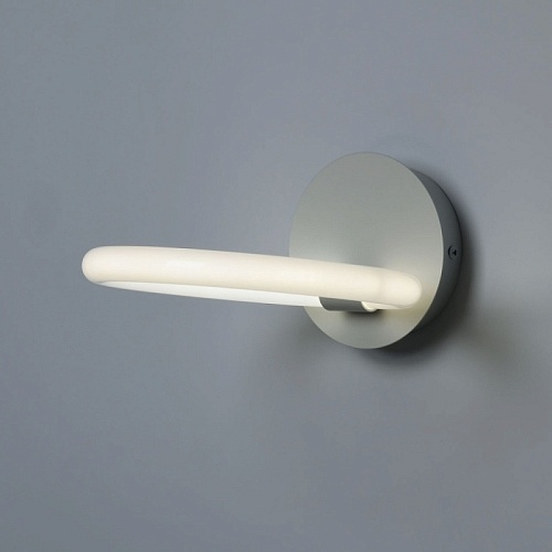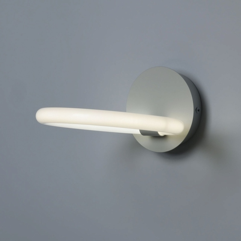 Металлическое основание настенного бра окрашено в белый цвет. Светодиодные источники света закрыты белым матовым акрилом.