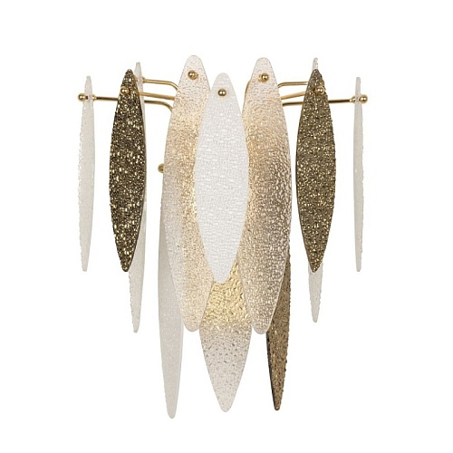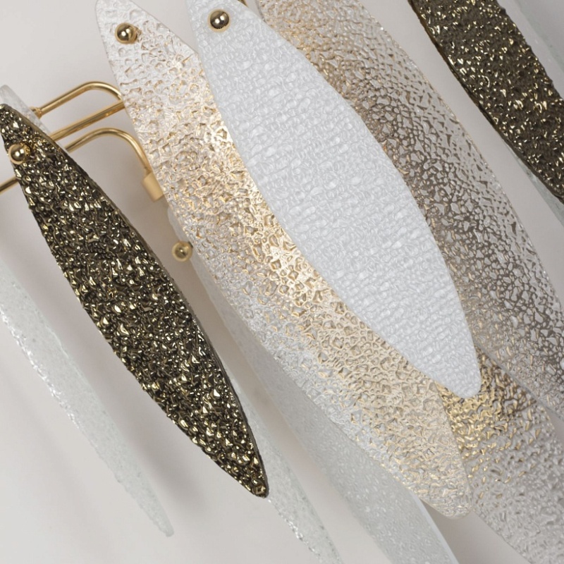 каркас золотого цвета, стеклянные полупрозрачные, белые и золотые пластины миндалевидной формы с эффектом мокрого стекла