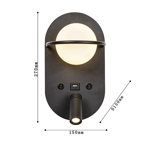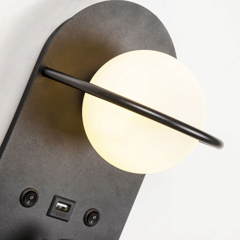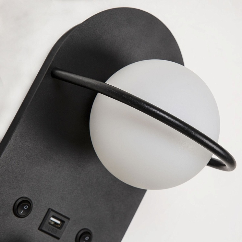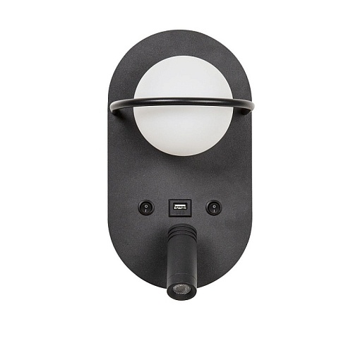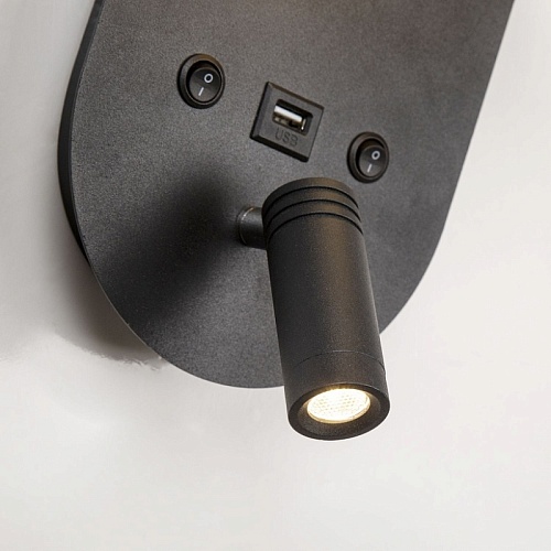 овальный каркас черного цвета, плафон выполнен из белого акрила с черным декоративным кольцом, поворотный спот LED черного цвета, два выключателя, USB