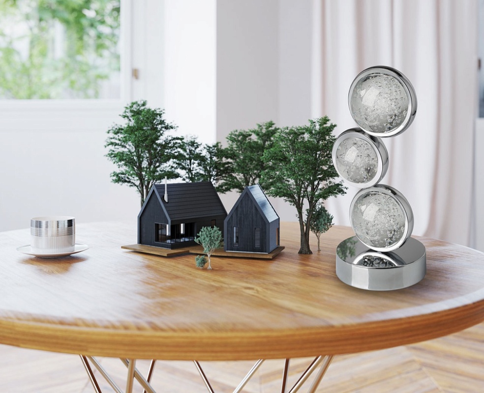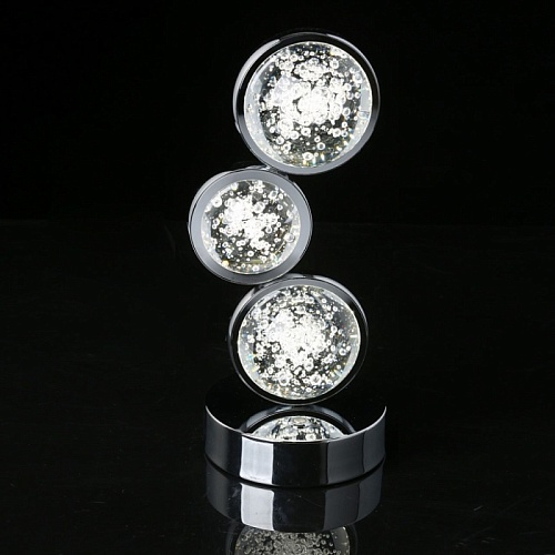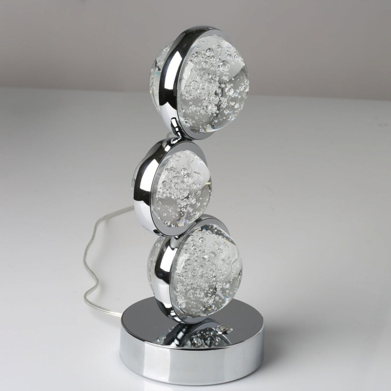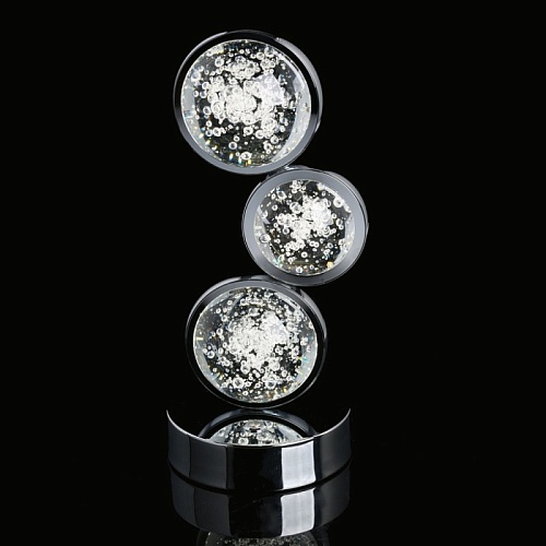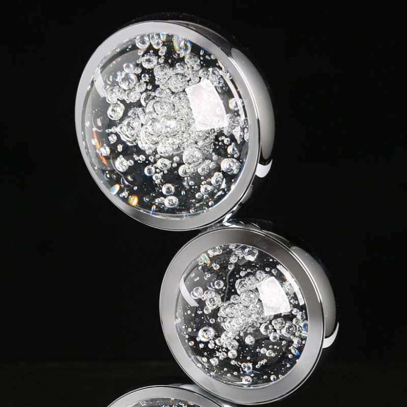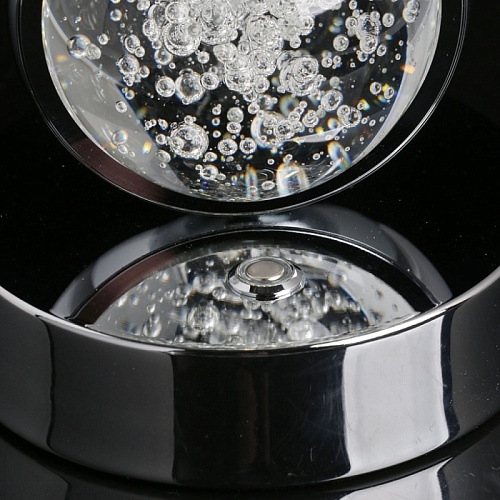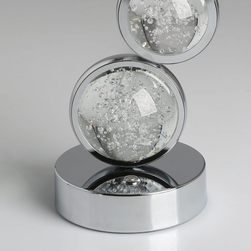 Основание светильника выполнено из сплава алюминия с цинком, обработано по технологии брашинга и гальванизировано в цвет хрома. Светодиодный источник света закрыт сферой из стекла с включениями пузырьков.
