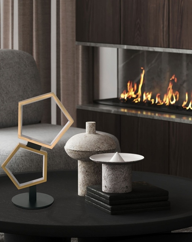 Металлическое основание настольной лампы окрашено в черный цвет. Многогранные плафоны выполнены из сплава алюминия с цинком, обработаны по технологии брашинг и гальванизированы в цвет латуни. Светодиодный источник света закрыт белым матовым акрилом.