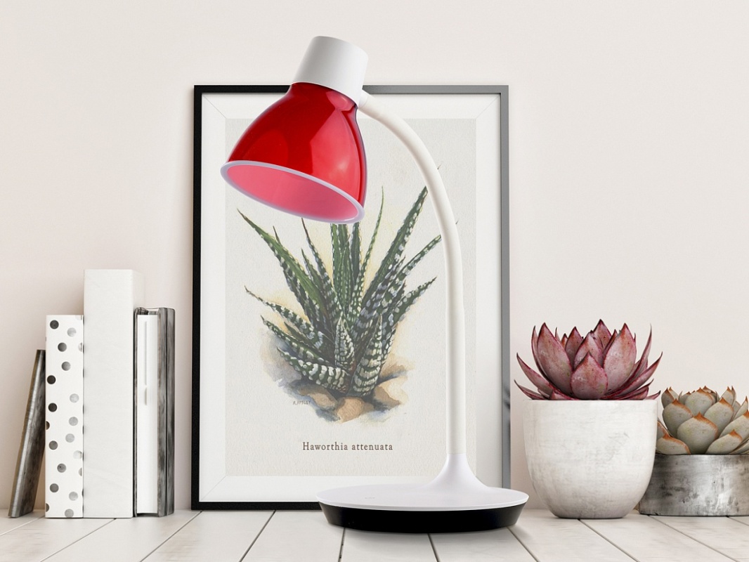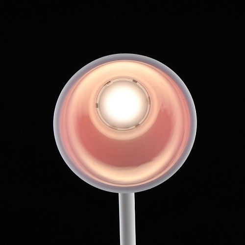 Основание светильника выполнено из акрила белого цвета. Гибкий держатель плафона выполнен из силикона белого цвета. Плафон выполнен из двухслойного акрила. Внутренний слой - белый матовый акрил, внешний - прозрачный глянцевый красный. Светодиодный источник света типа SMD Chip закрыт белым матовым акрилом.