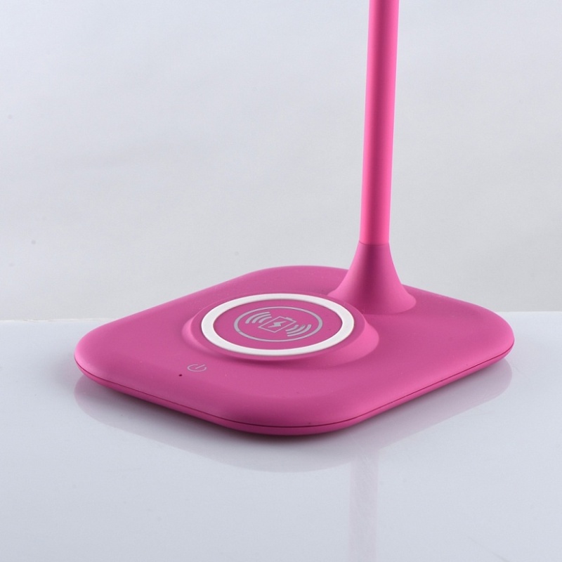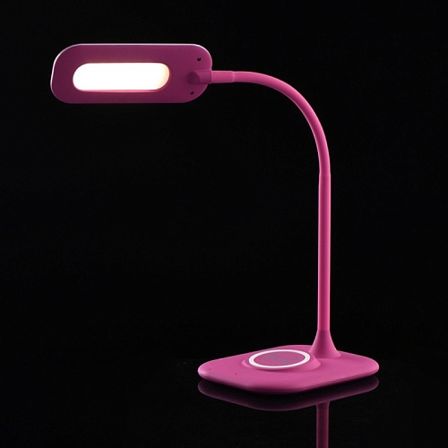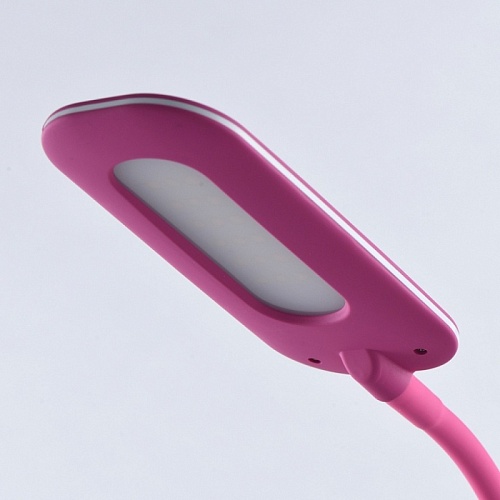 Основание светильника и плафон выполнены из акрила розового цвета. Гибкий держатель плафона выполнен из силикона розового цвета. Светодиодный источник света типа SMD Chip закрыт белым матовым акрилом.