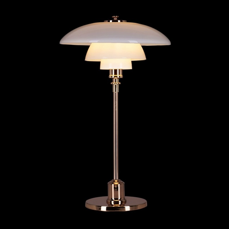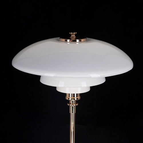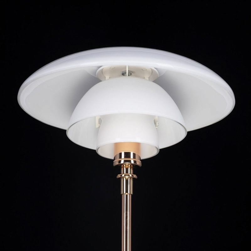 Металлическое основание настольной лампы гальванизировано в цвет золота. Настольная лампа декорирована тройным стеклянным плафоном белого глянцевого цвета.