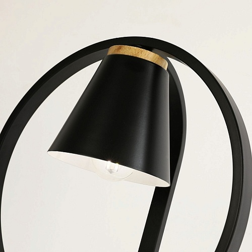 Металлический каркас матового черного цвета, декоративные вставки из светлого дерева, декоративный элемент в виде белой акриловой птицы, сидящей на декоративном обруче.