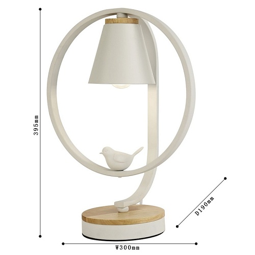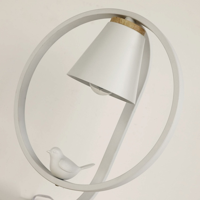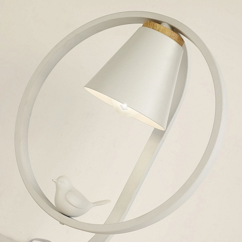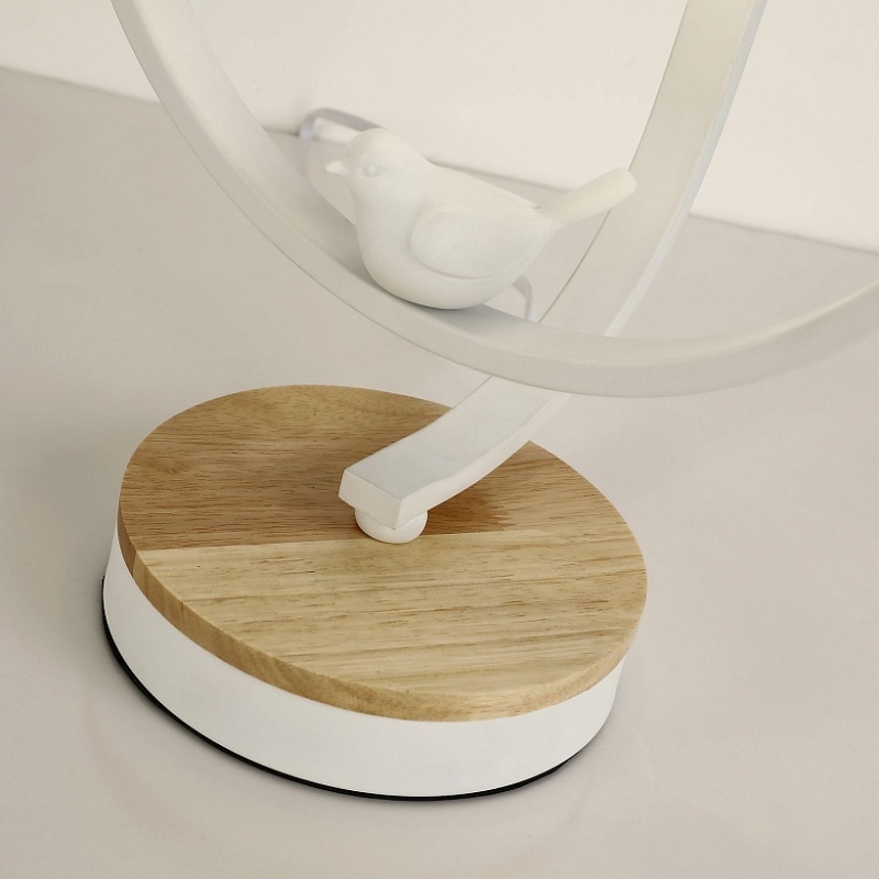 Металлический каркас матового белого цвета, декоративные вставки из светлого дерева, декоративный элемент в виде белой акриловой птицы, сидящей на декоративном обруче.