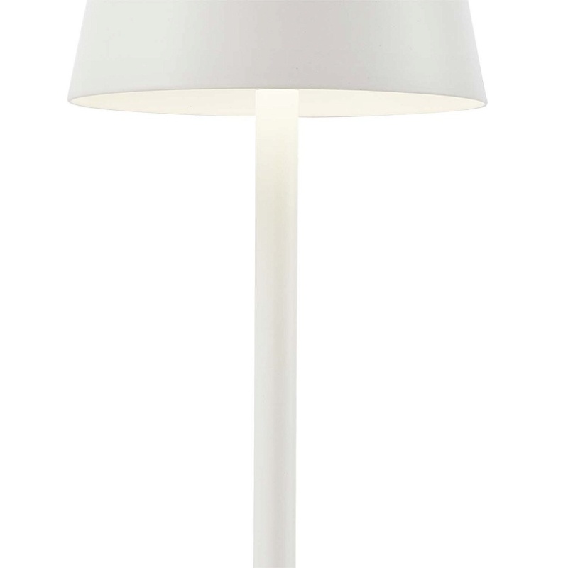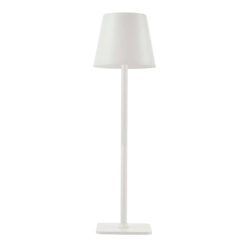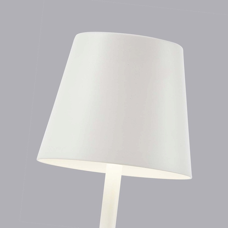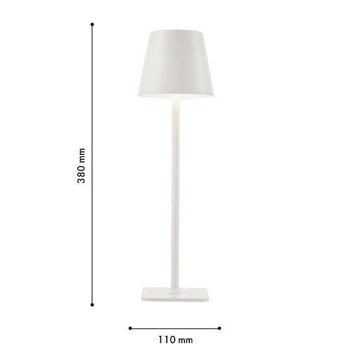Беспроводная лампа, корпус из металла белого цвета, рассеиватель из акрила, управление касанием, зарядка через USB-порт, LED-модуль.
