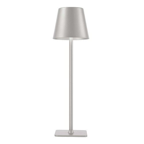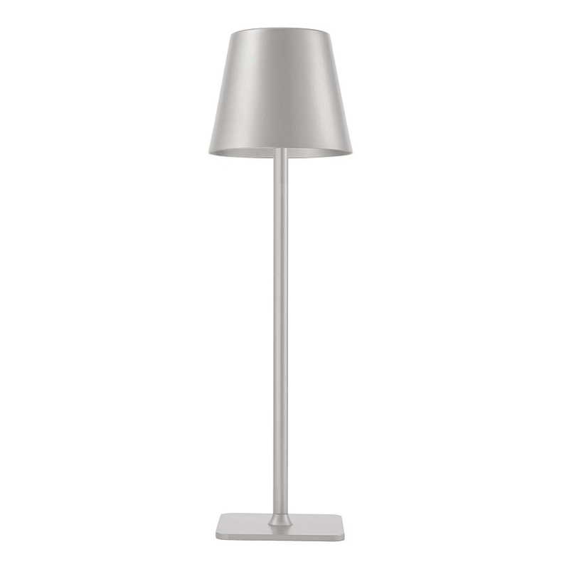 Беспроводная лампа, корпус из металла серого цвета, рассеиватель из акрила, управление касанием, зарядка через USB-порт, LED-модуль.