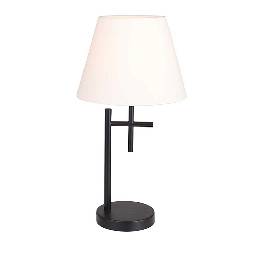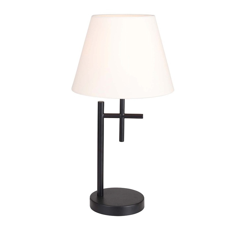 Каркас из металла черного матового цвета, белый тканевый абажур, выключатель на проводе, цоколь Е14.