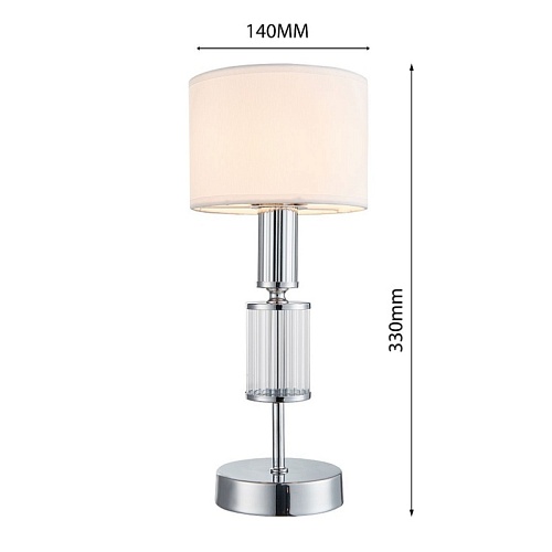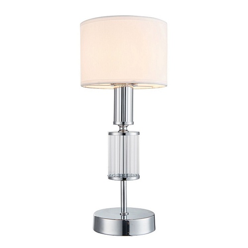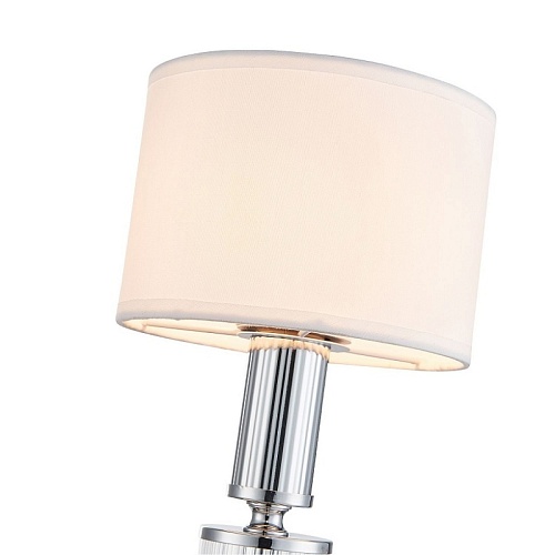Хромированный металлический каркас, плафоны из белой ткани, декоративные элементы из прозрачного стекла.