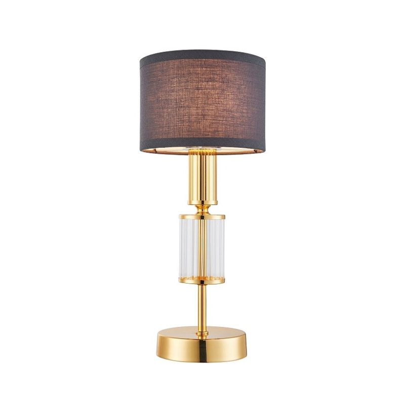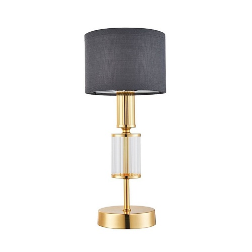 Хромированный металлический каркас, плафоны из серой ткани, декоративные элементы из прозрачного стекла.