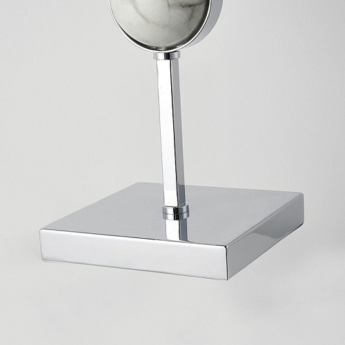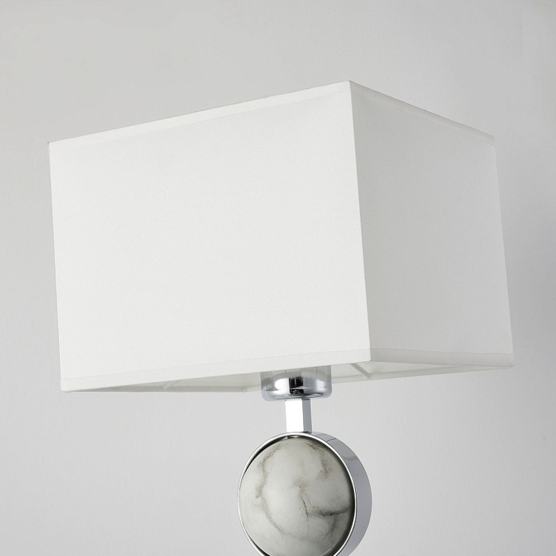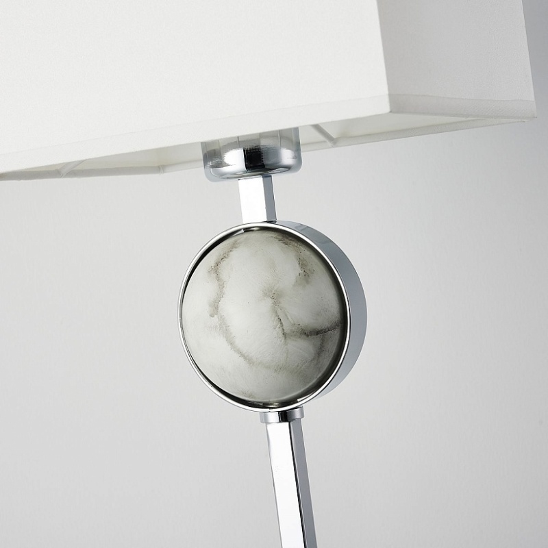 Хромированный металлический каркас , плафон из белой ткани, декор - имитация белого мрамора.
