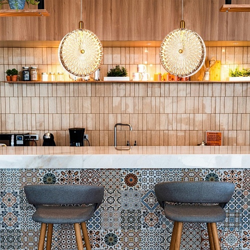 Каркас черного цвета, плафон состоит из двух узорных стеклянных дисков прозрачного и янтарного цвета, внутри которых расположен LED-модуль, регулируемая высота.
