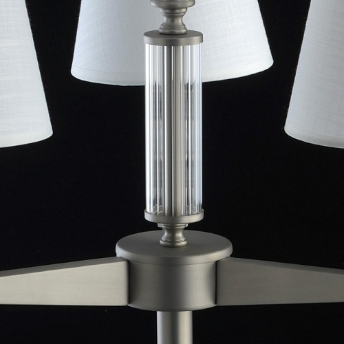 Основание светильника выполнено из комбинации сплавов металлов и гальванизировано в цвет никеля.Основа - металл, обработка на токарном станке.Рожки - сплав алюминия, художественное литье.Декор - прозрачное стекло.Тканевые абажуры - белого цвета, с кантом сверху и снизу в цвет абажура. С внутренней стороны термостойкий акрил. Абажуры прошиты.