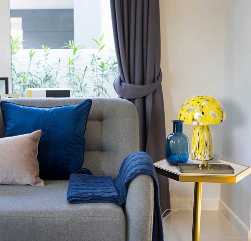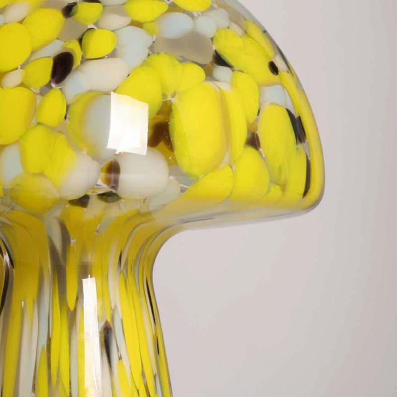 Основание настольной лампы выполнено из высококачественного акрила черного цвета. Плафон в форме гриба выполнен из стекла, окрашенного в массе в желтый, белый, голубой и черный цвета.