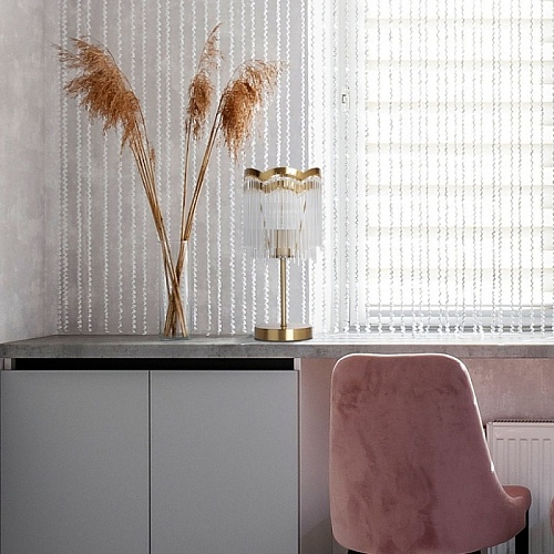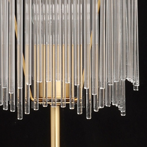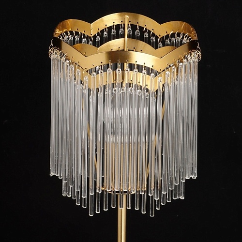 Металлическое основание настольной лампы гальванизировано в цвет латуни. Настольная лампа декорирована прозрачными стеклянными трубочками.